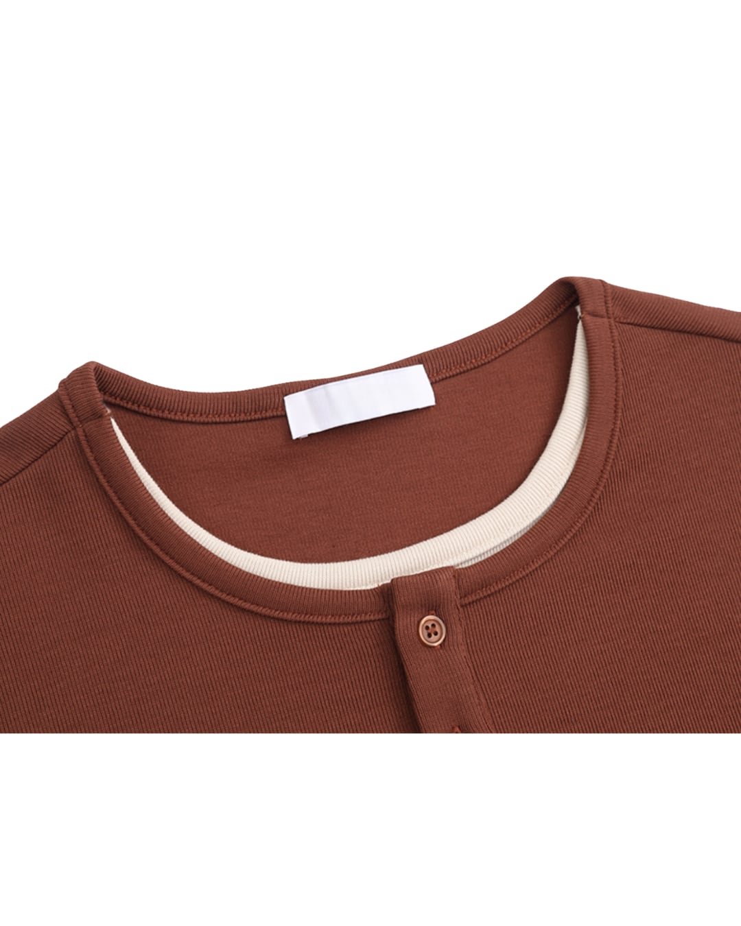 すっきりとしたシルエットが魅力のフェイク重ね着ヘンリーネック長袖トップス。
