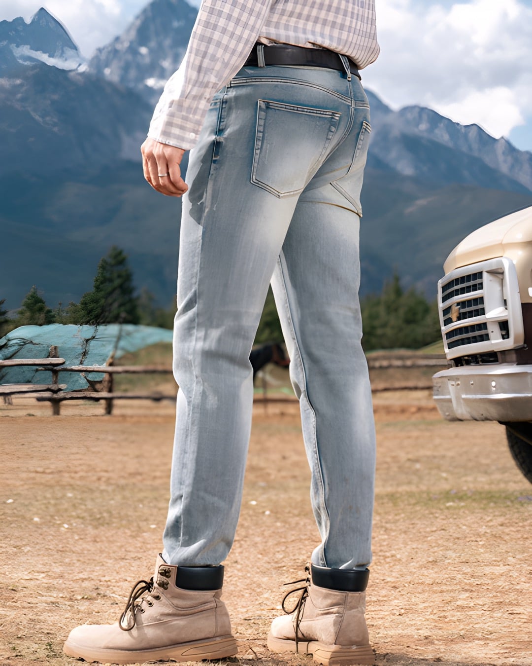 レギュラーフィットのストレートデニムパンツは、さりげないダメージ加工がこなれた雰囲気を演出。