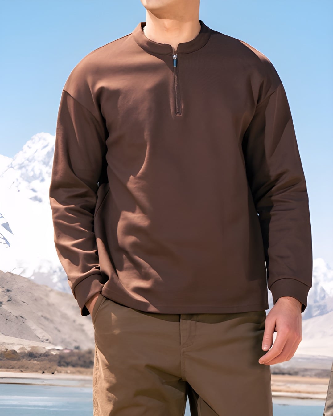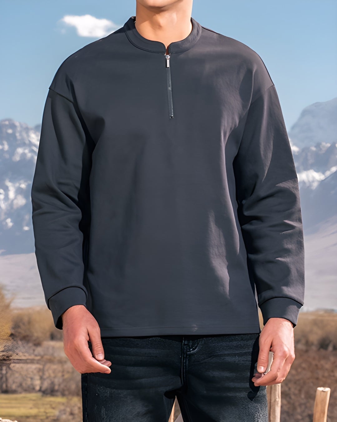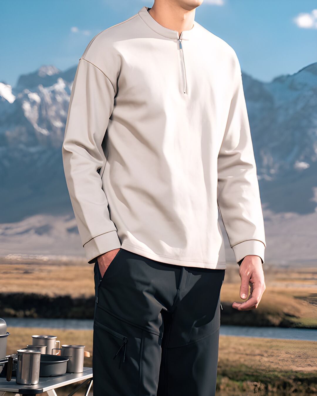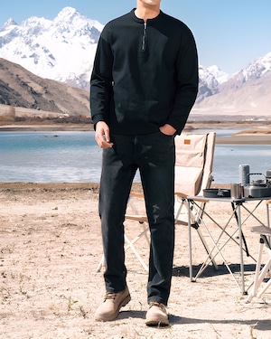 ハーフジップのデザインが、着こなしに程よいアクセントを加えます。