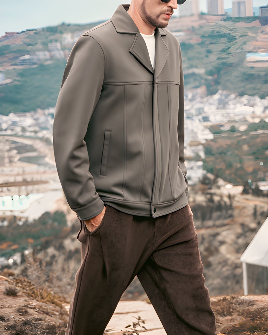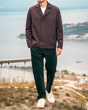 比翼仕立てのノーカラーデザインは、カジュアルになりすぎず、上品な印象を与えます。