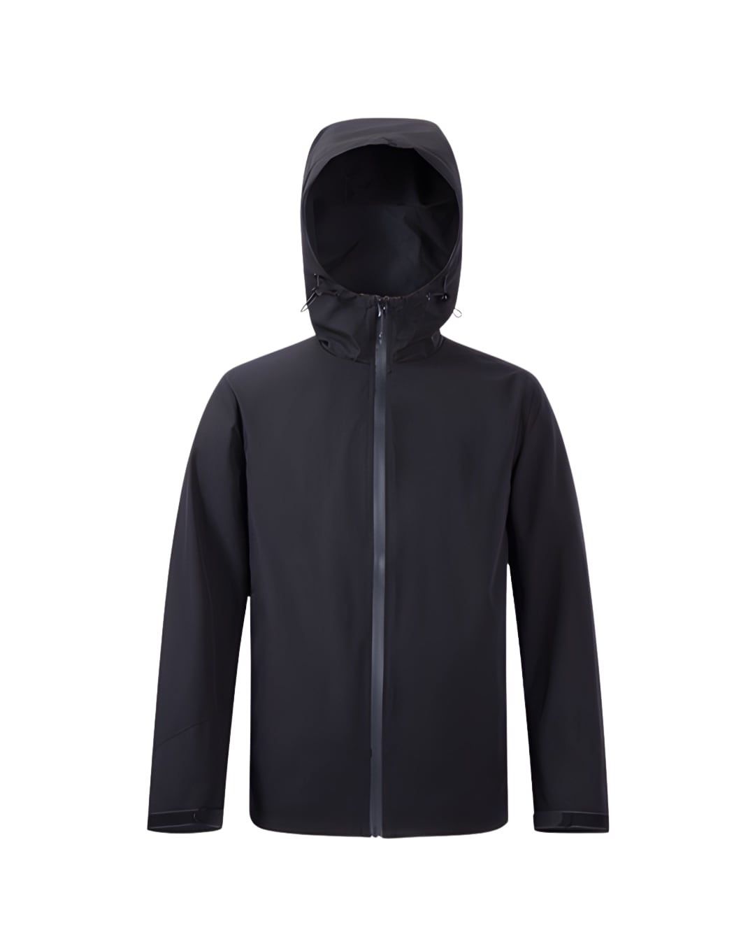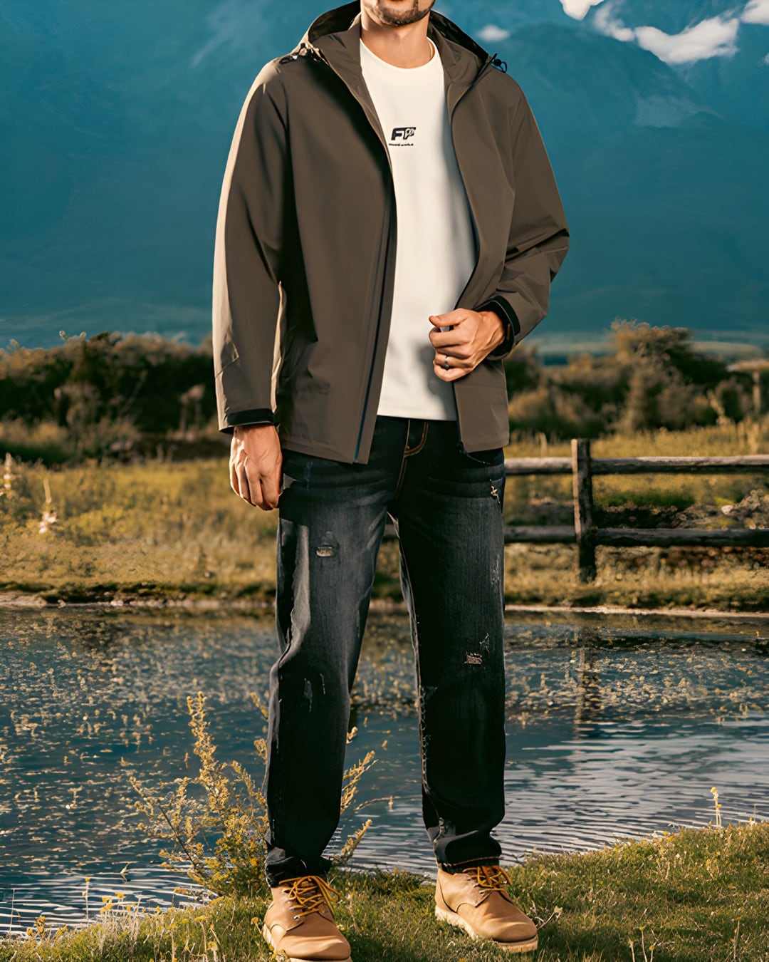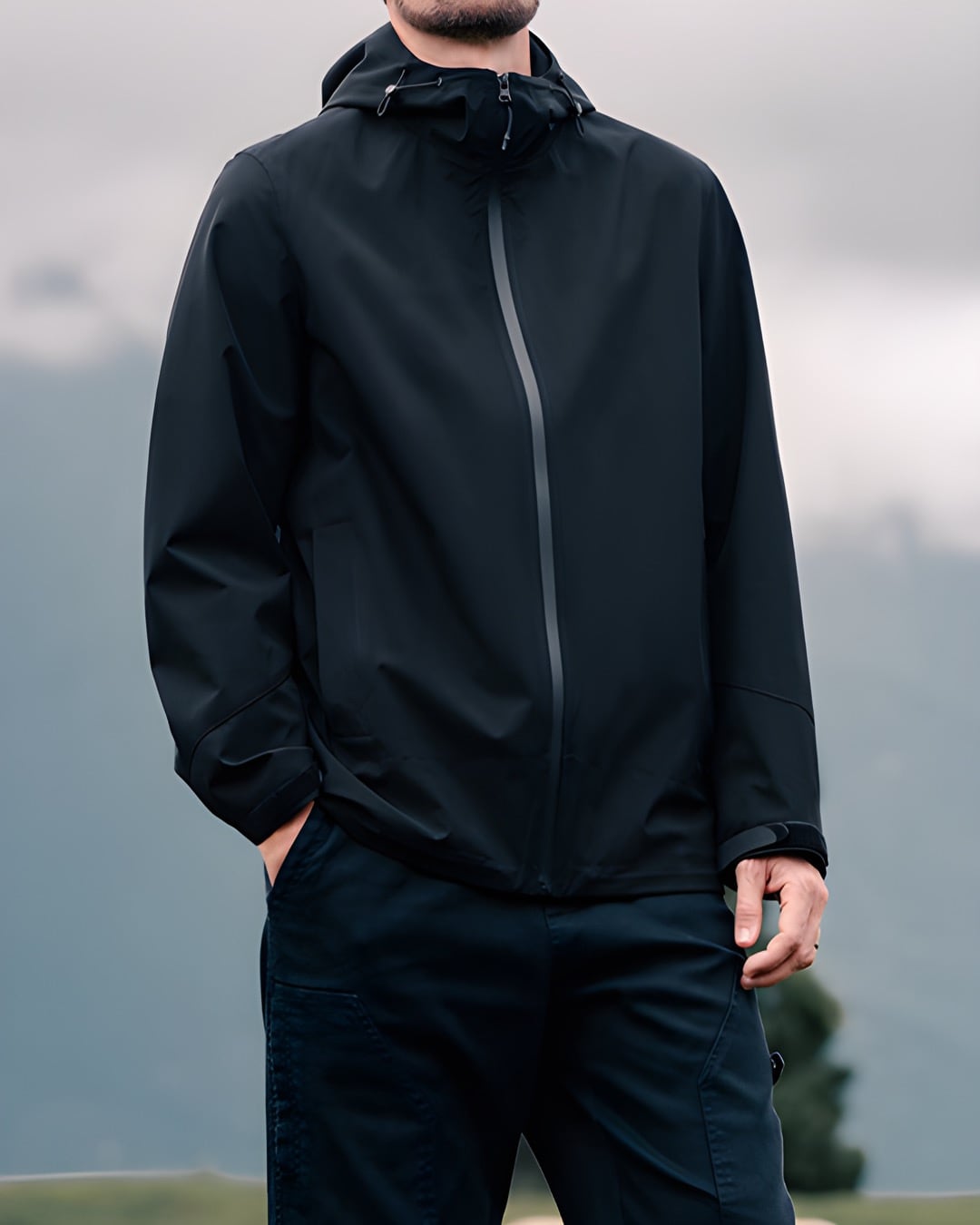 シンプルなデザインながら、着る人の個性を引き立てるフード付きライトジャケット。