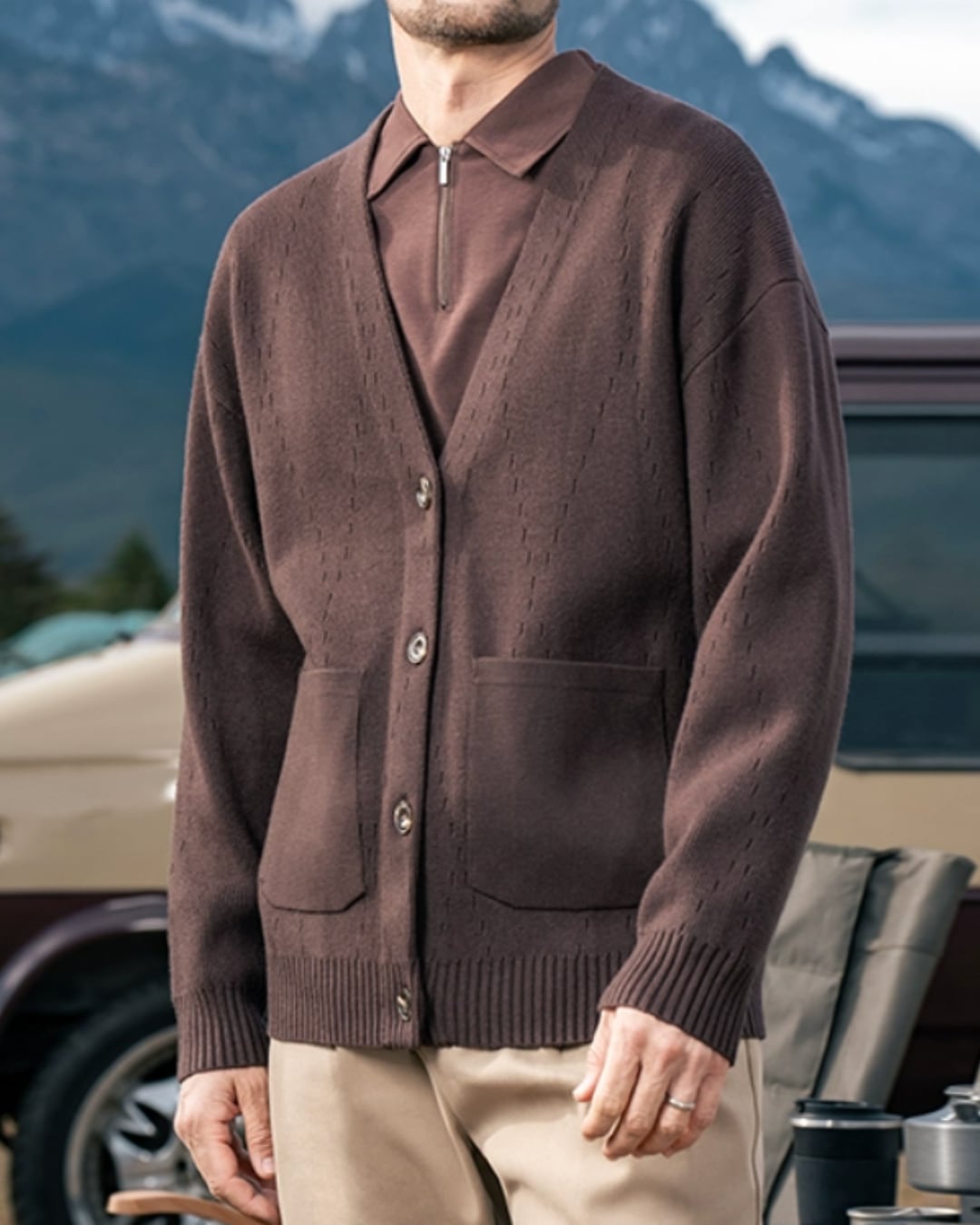 Vネックとパッチポケットが特徴的な長袖ニットカーディガン。