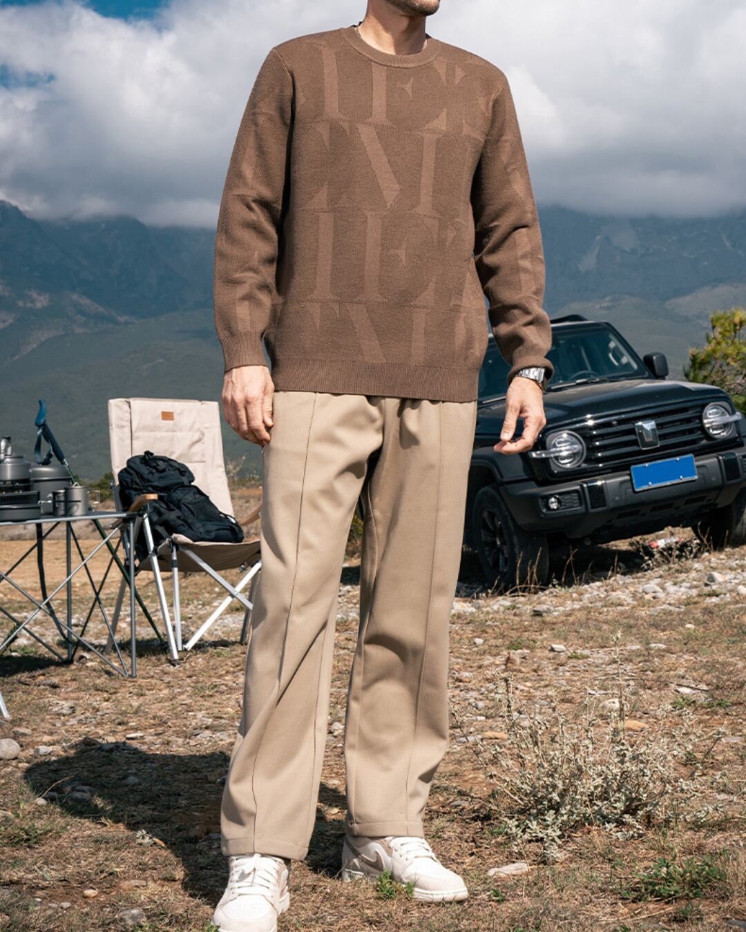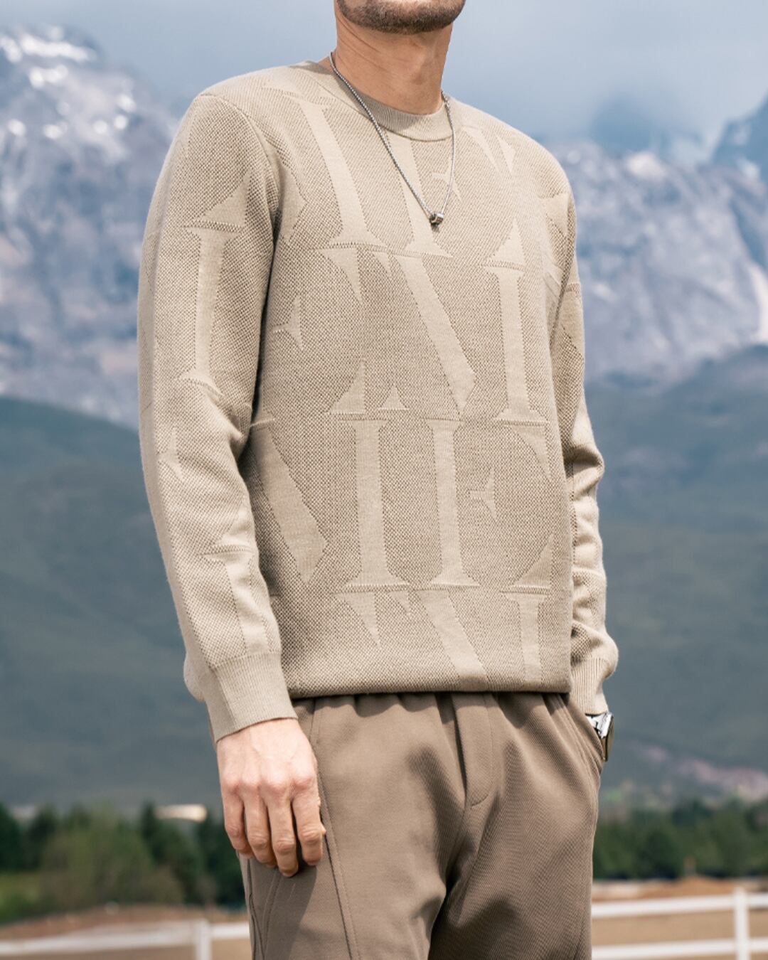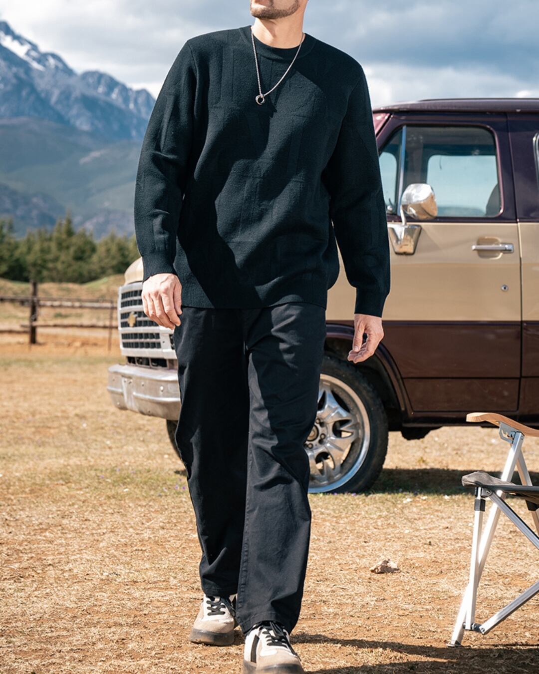 首元をすっきりと見せるクルーネックデザインで、インナーにシャツを合わせるのもおすすめ。