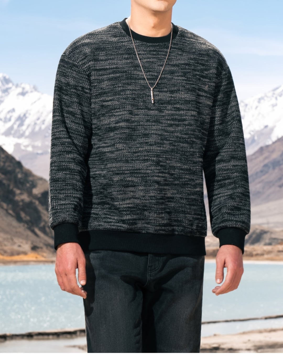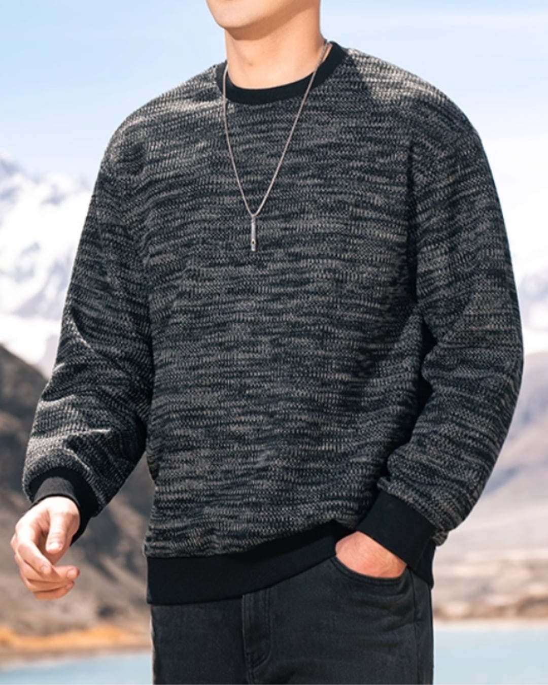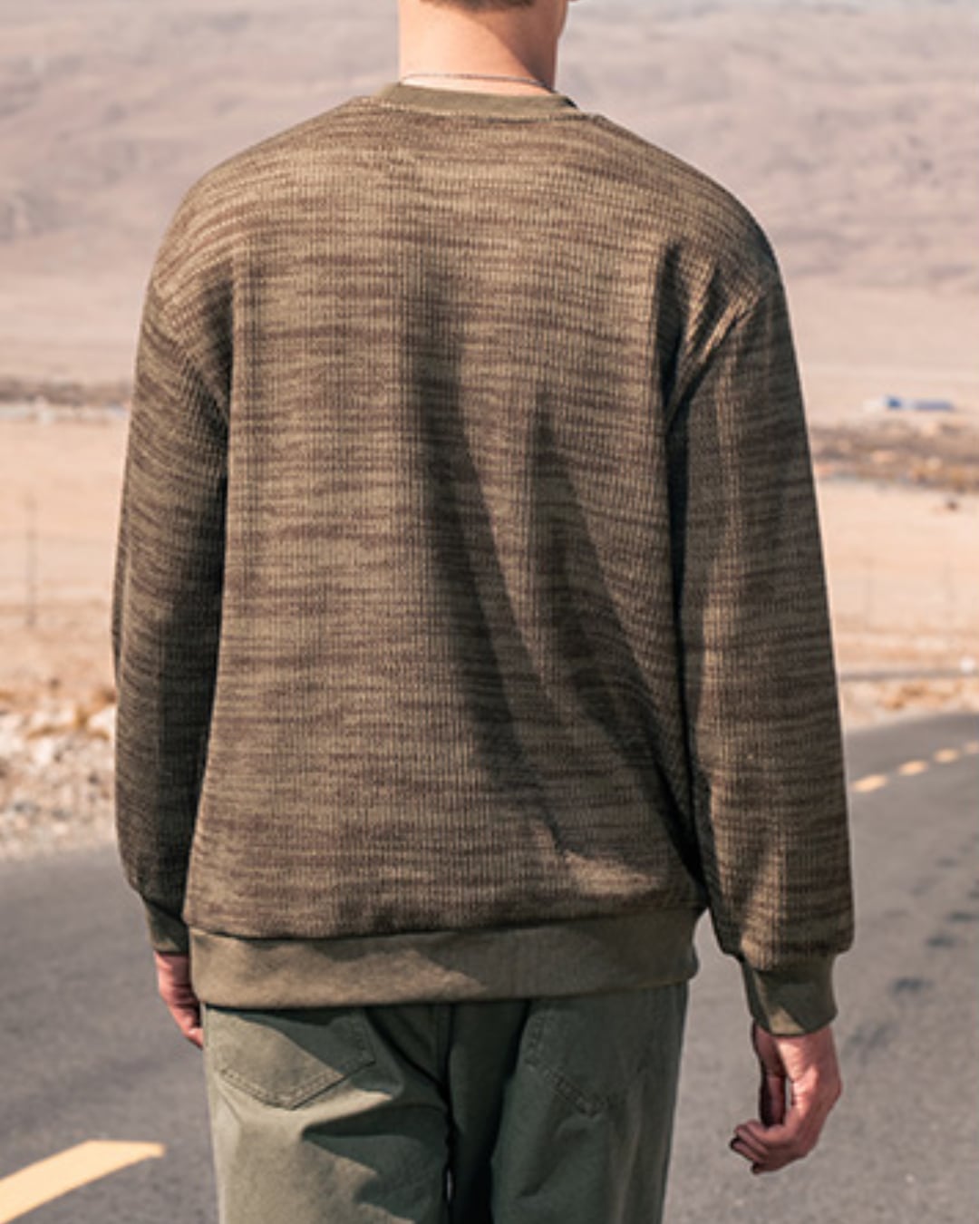 首元はクルーネックで、すっきりとした印象を与えます。