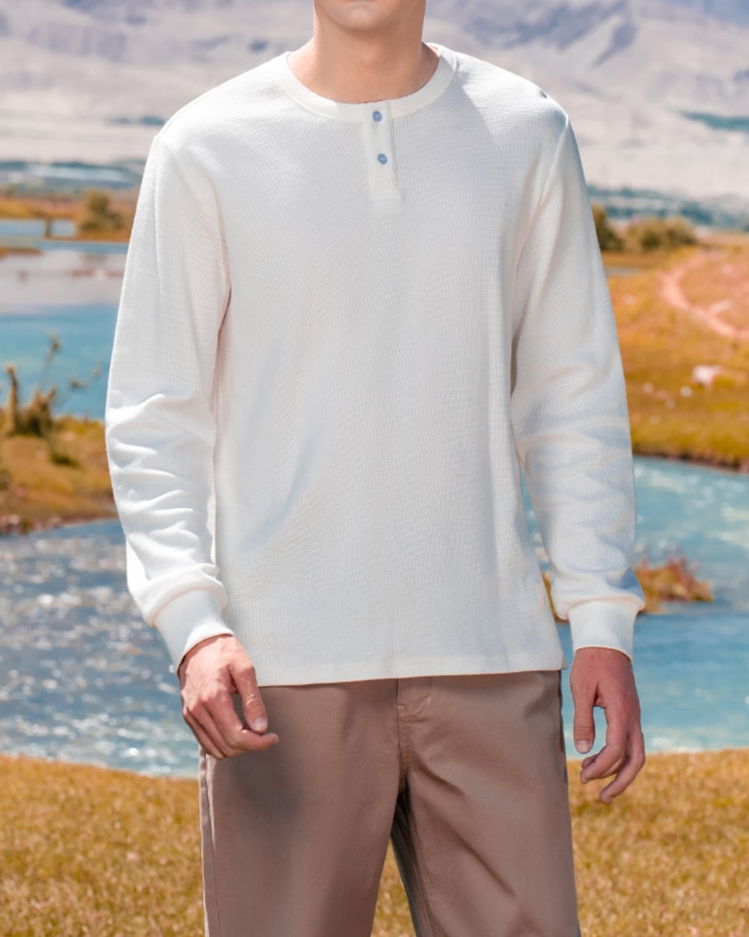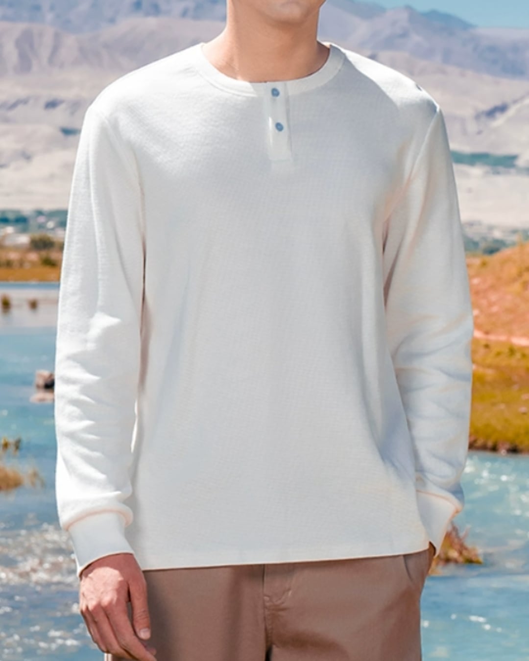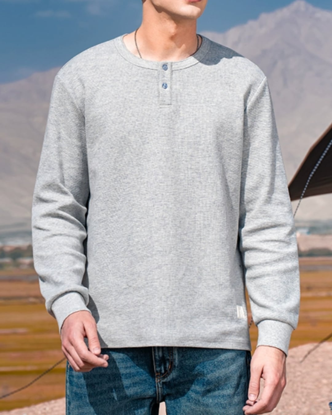 ヘンリーネックデザインがさりげないアクセントを加える長袖Tシャツ。
