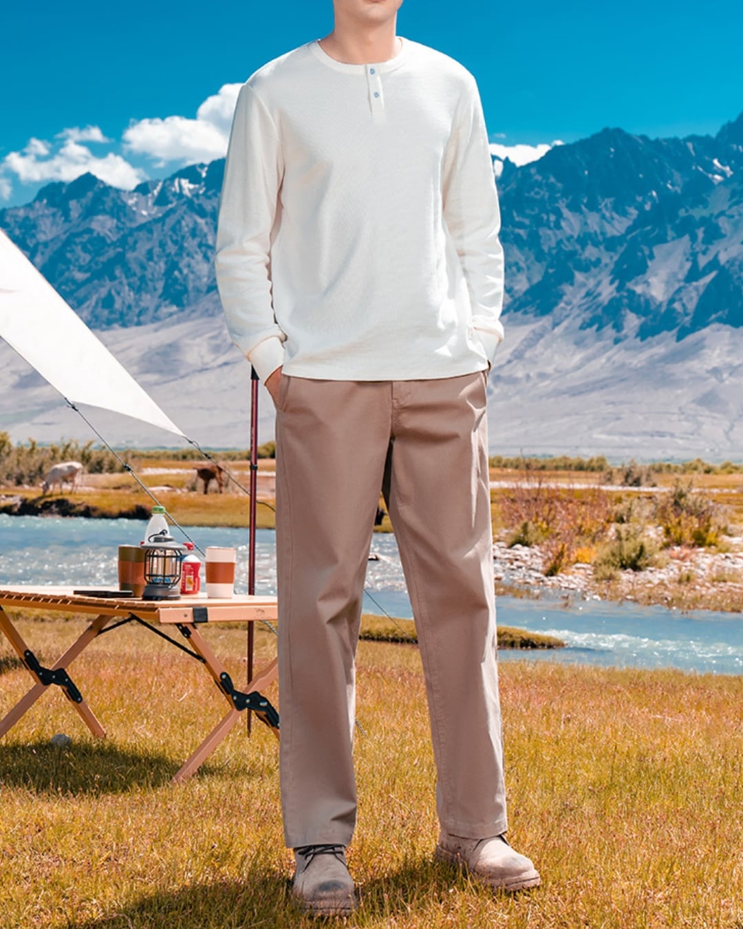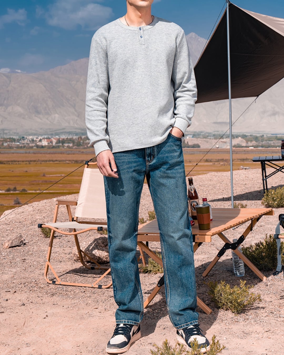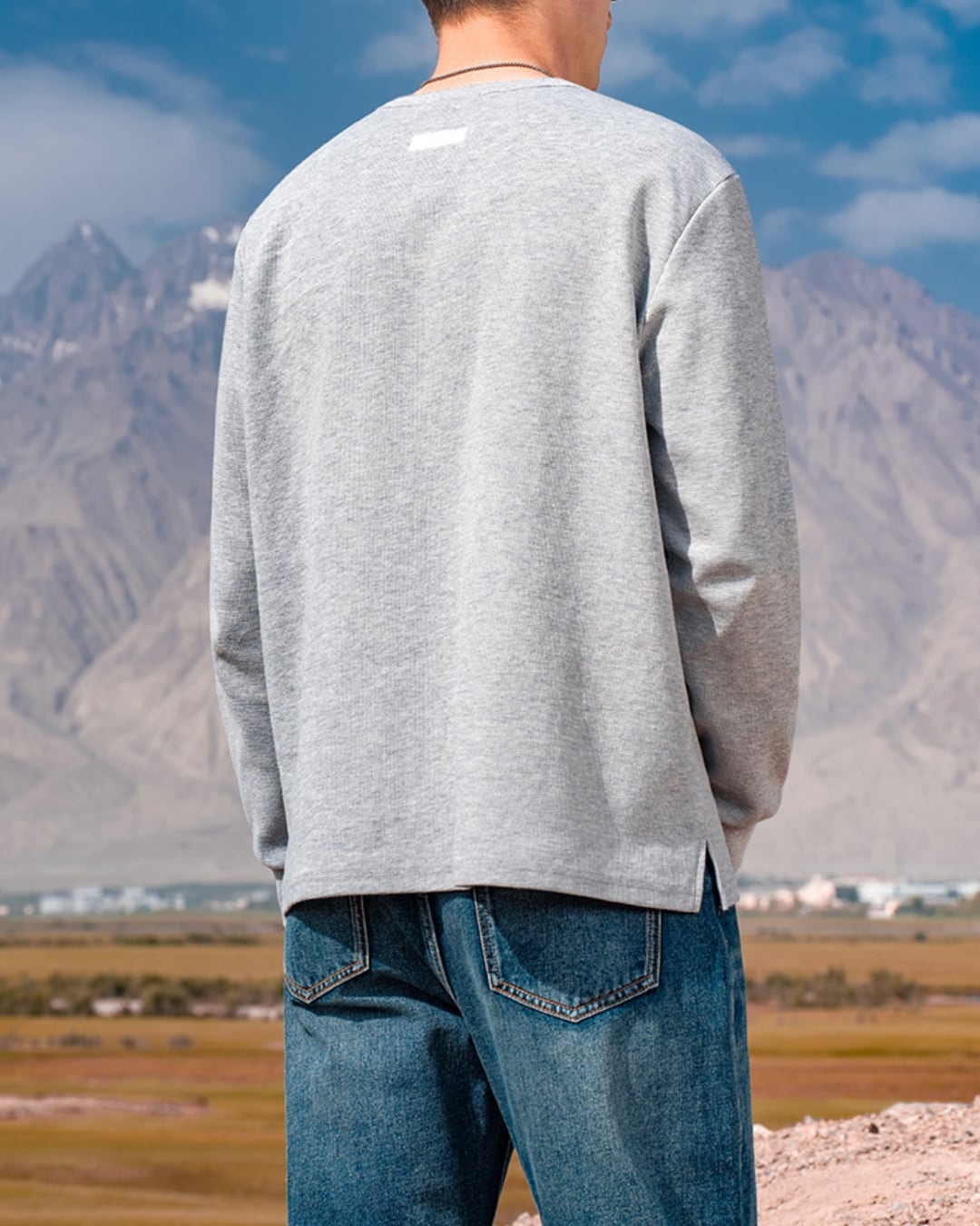 ヘンリーネックデザインがさりげないアクセントを加える長袖Tシャツ。