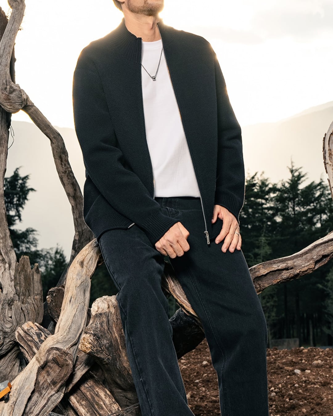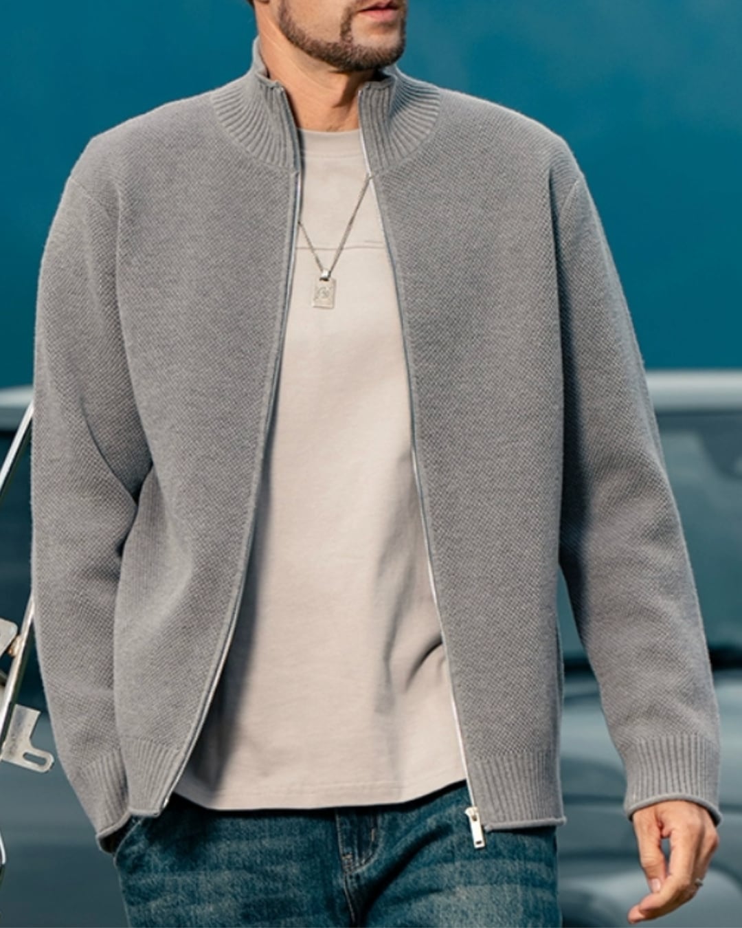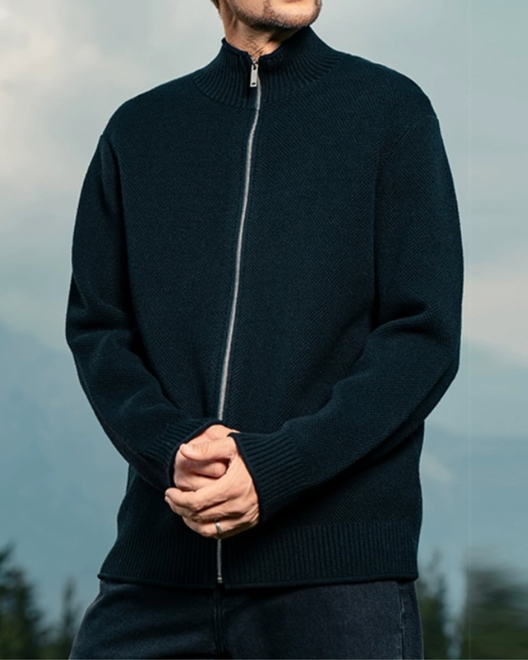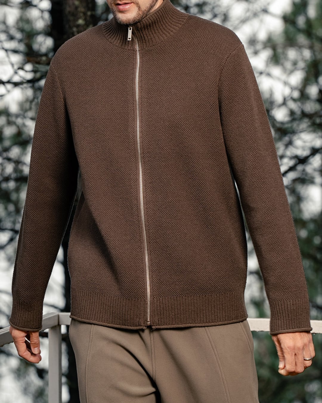 カジュアルにもきれいめにも着こなせる、ジップアップ長袖ニットブルゾン。