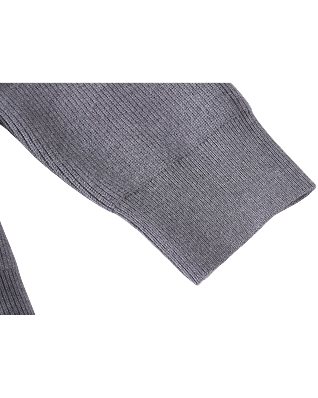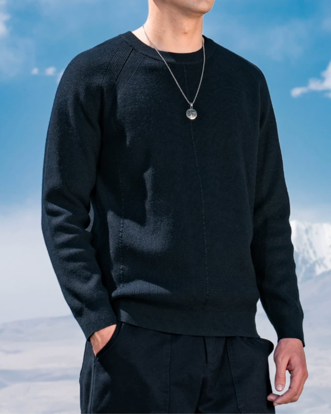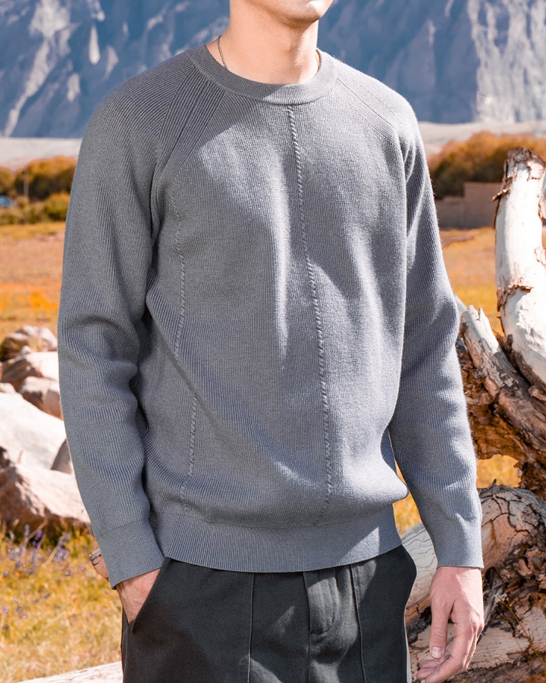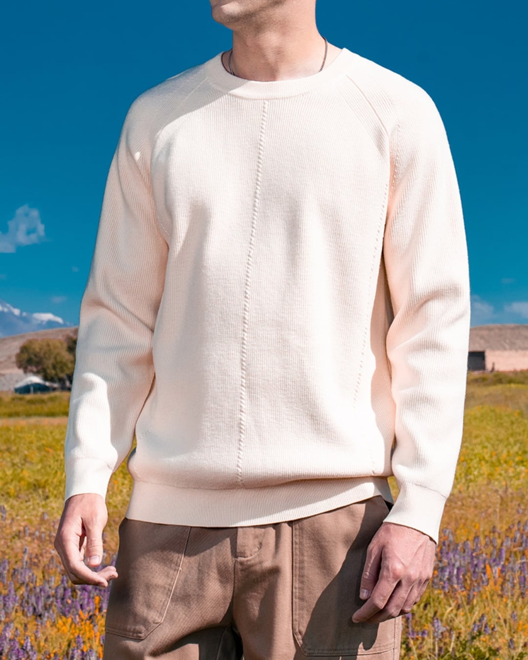 リブ編みの長袖クルーネックニットは、シンプルながらも洗練された印象。