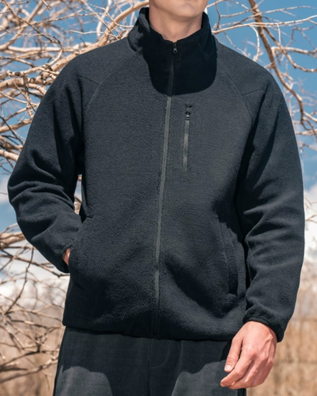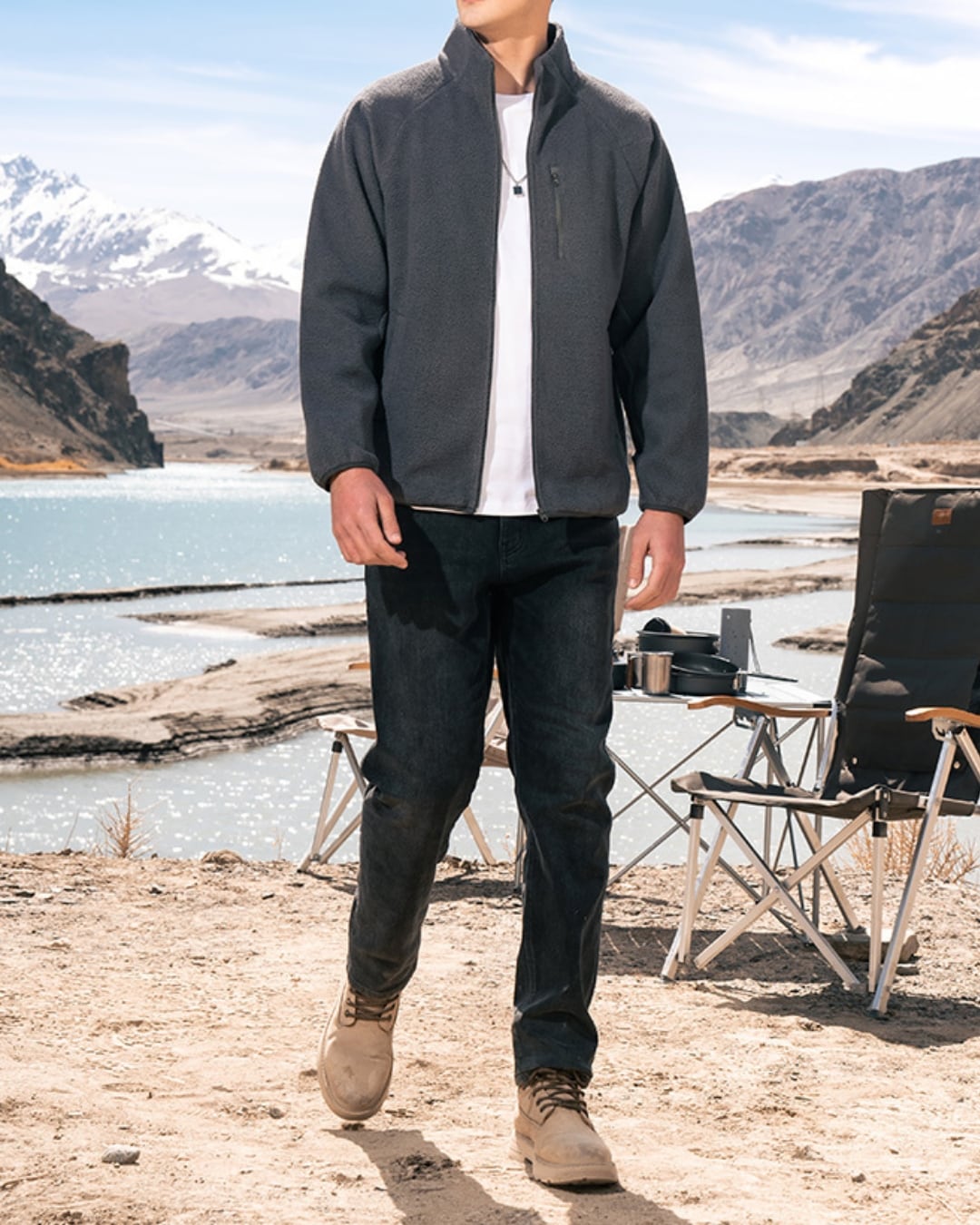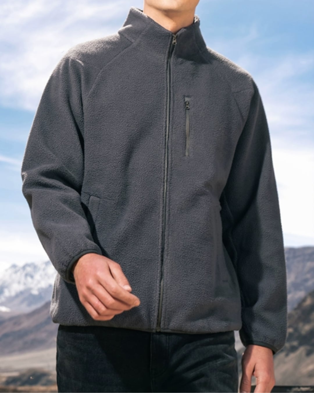 アウトドアシーンに最適な、ジップアップタイプの長袖フリースジャケット。