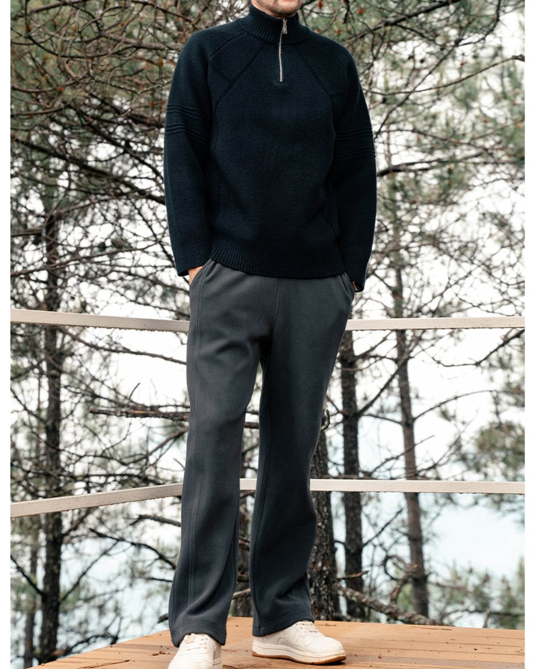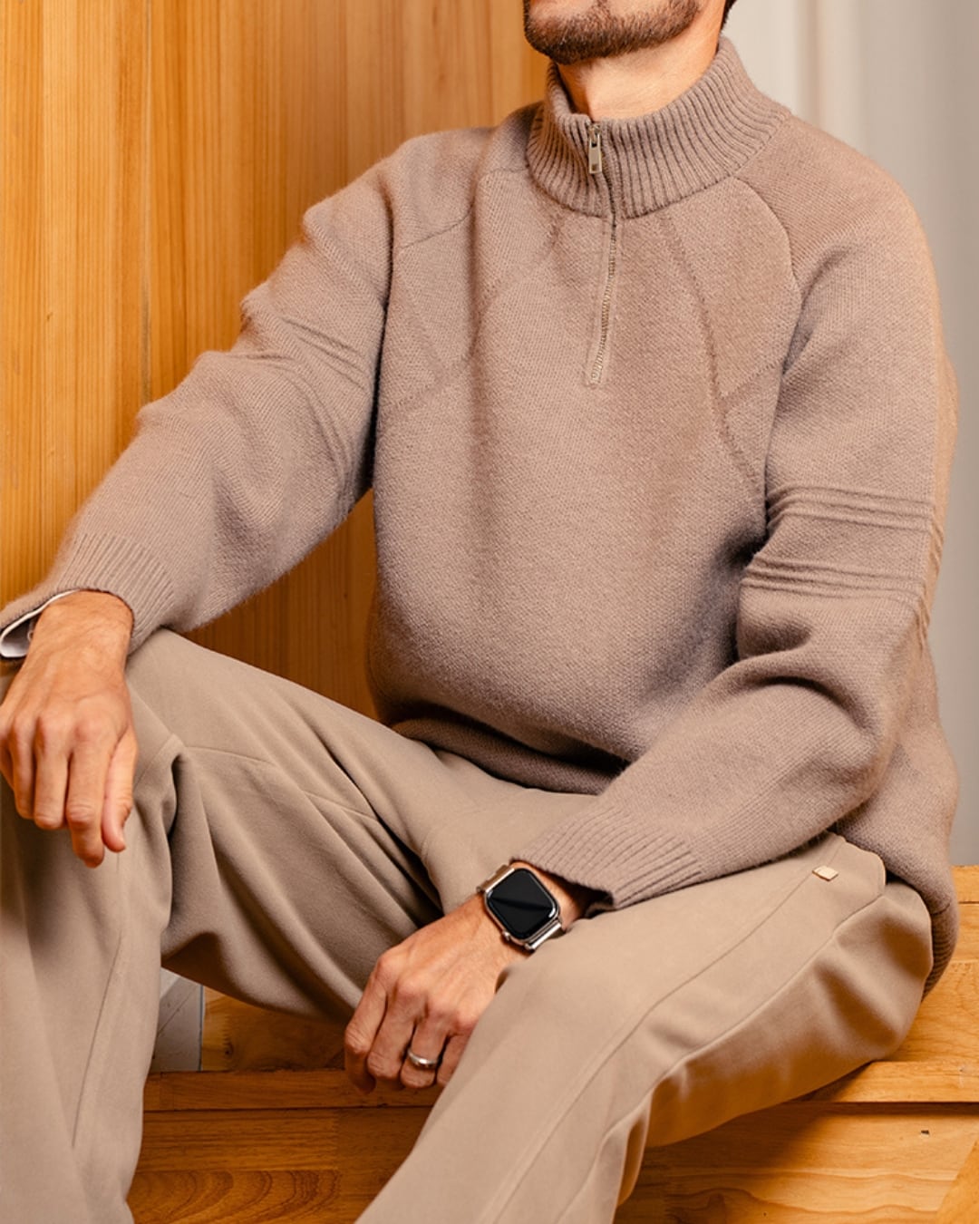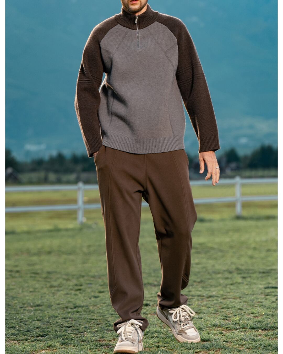 ハーフジップ仕様なので、気温や好みに合わせて首元の開きを調整できます。落ち着いた色合いで、様々なボトムスと相性抜群です。