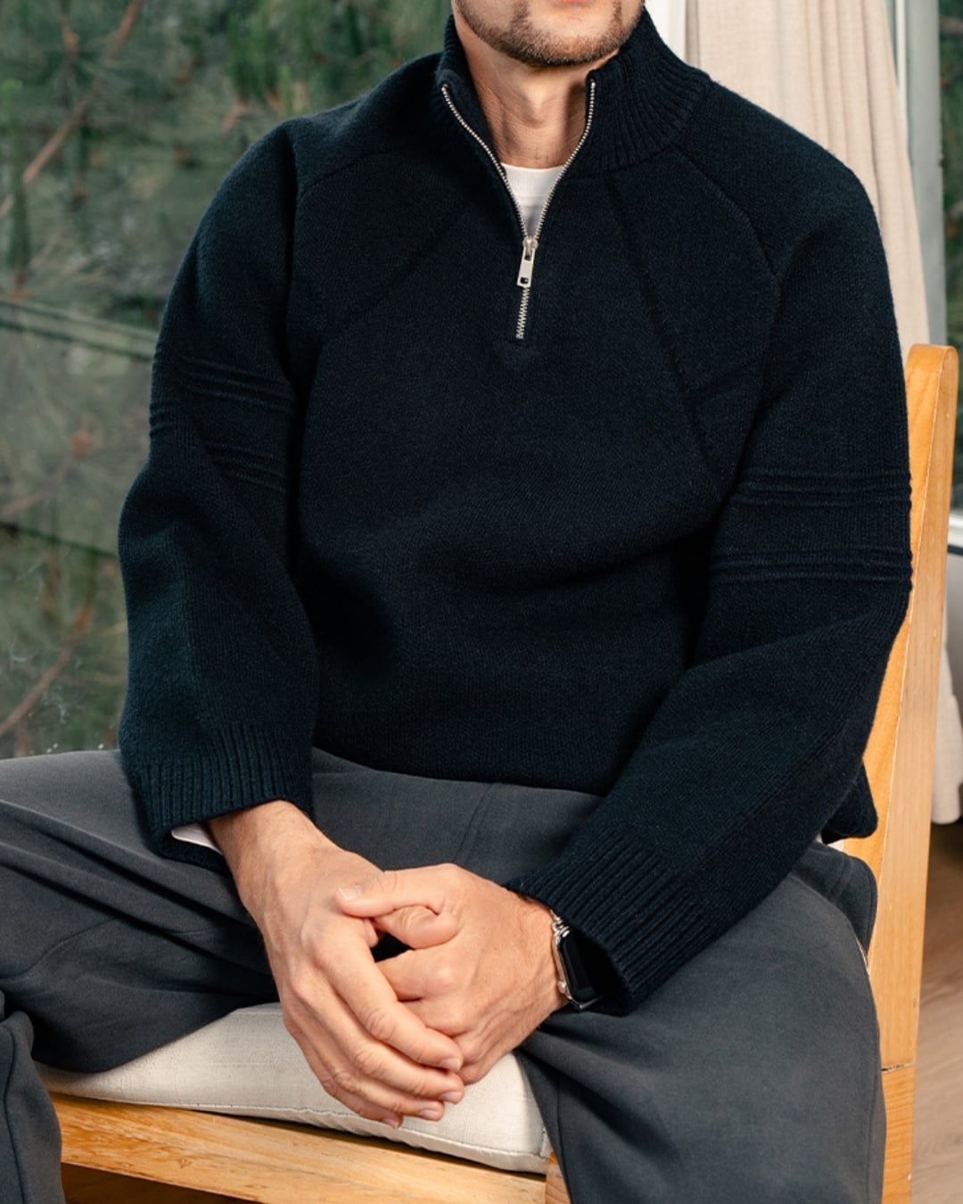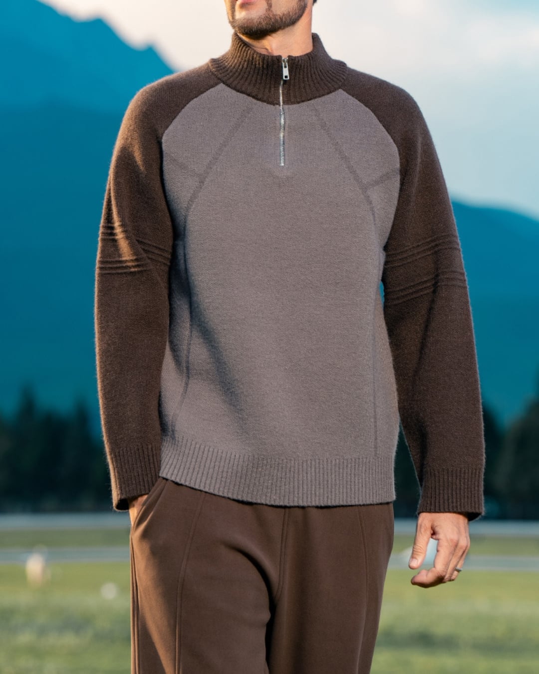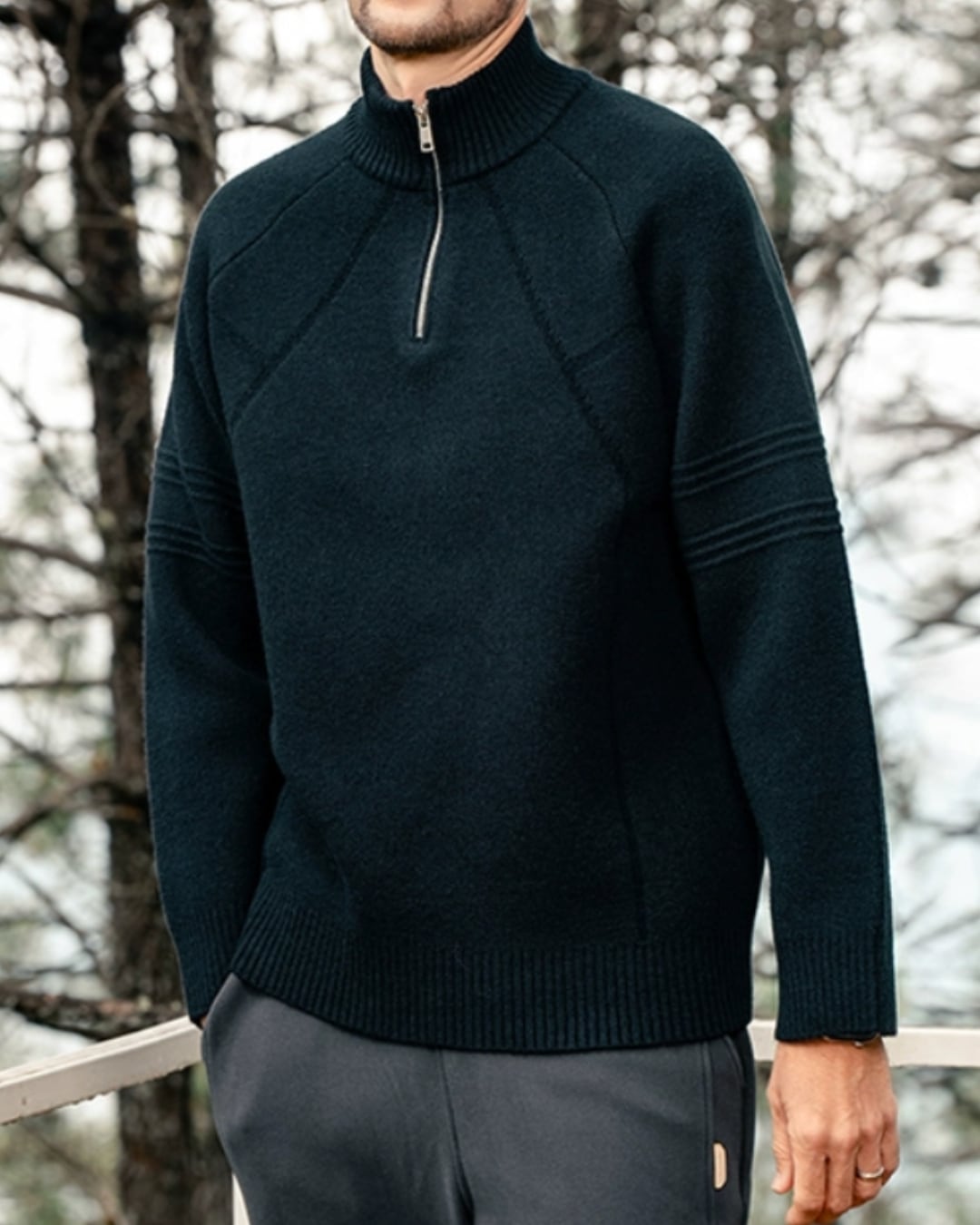 ハーフジップ仕様なので、気温や好みに合わせて首元の開きを調整できます。落ち着いた色合いで、様々なボトムスと相性抜群です。