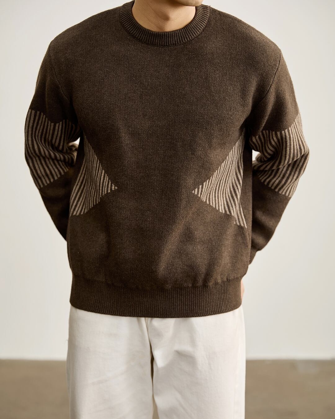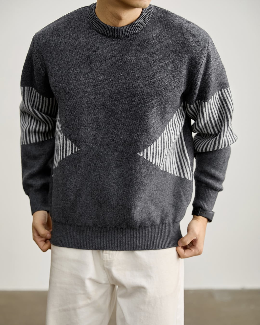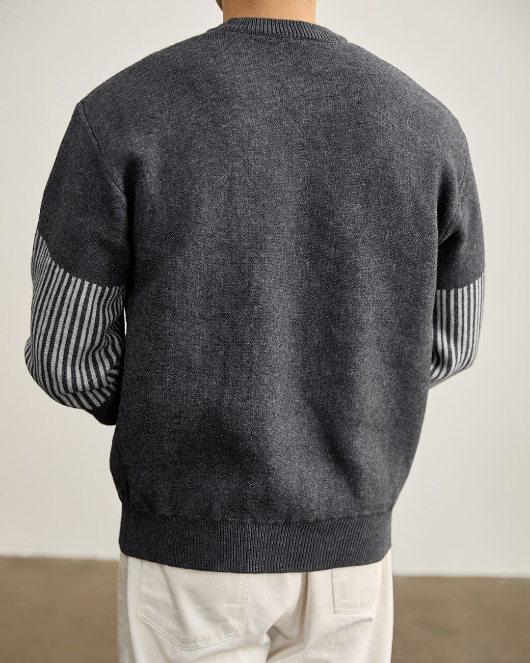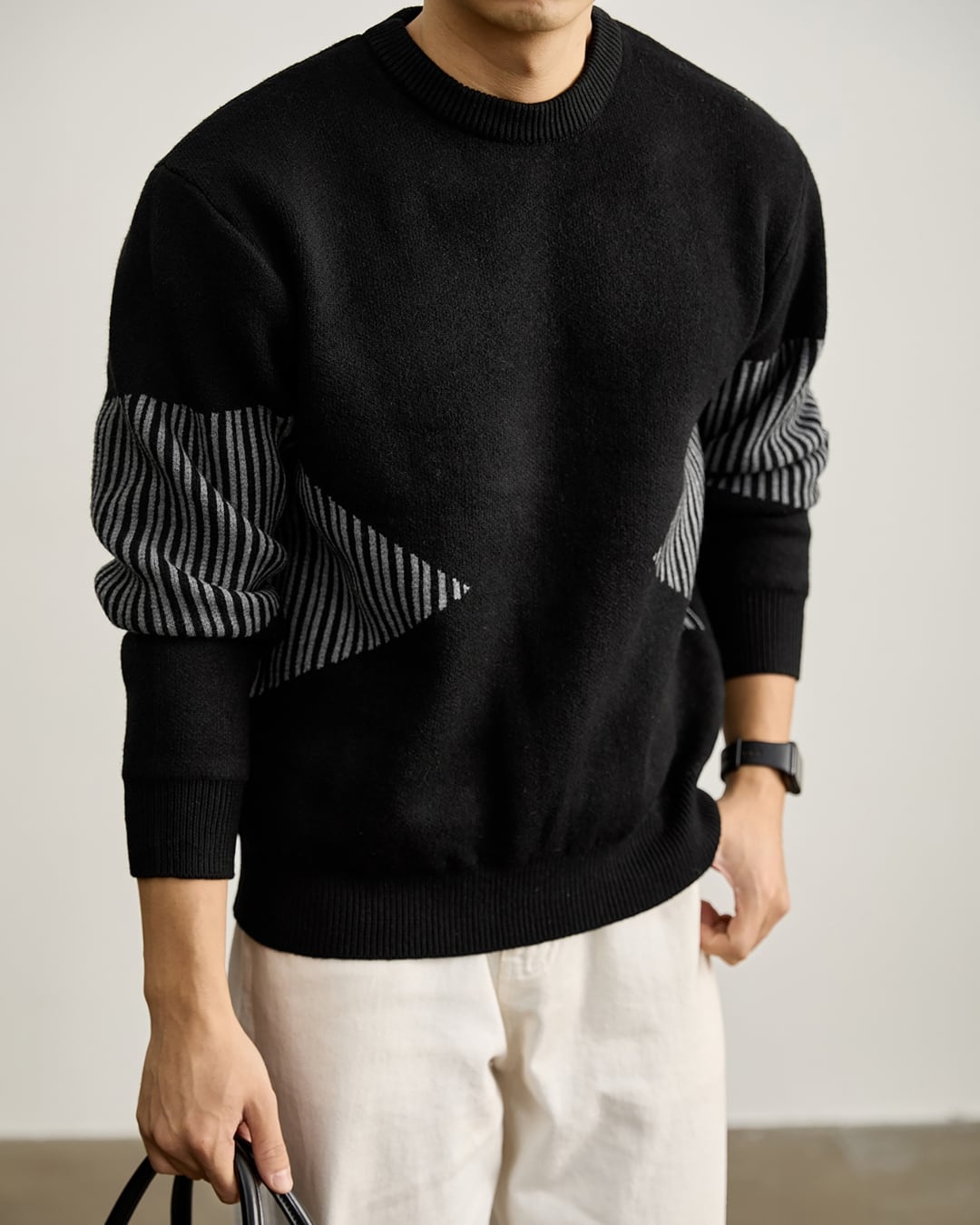袖部分に施したストライプ調の切り替えが印象的なクルーネックニット。