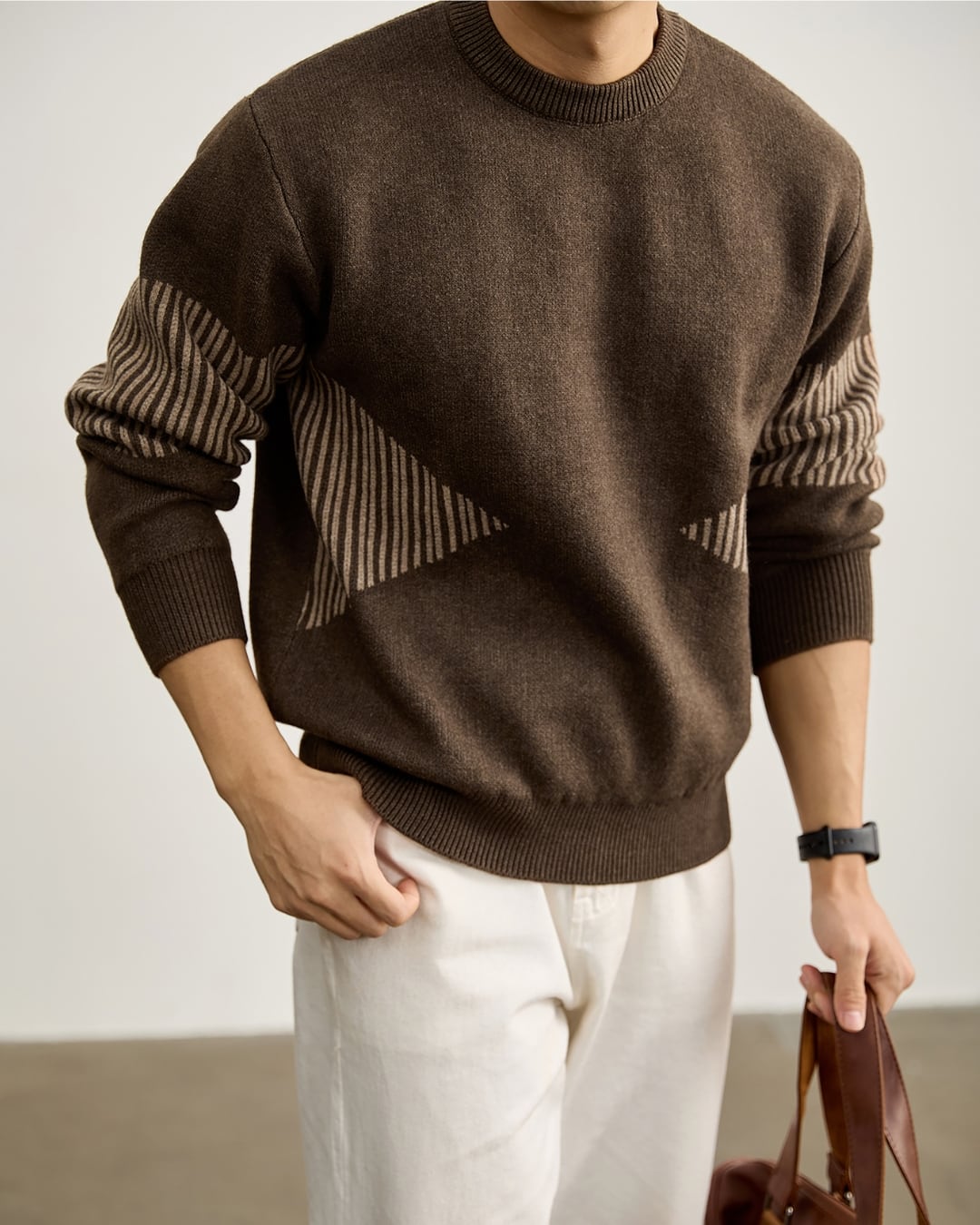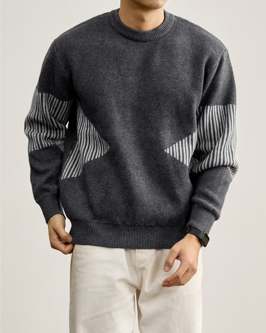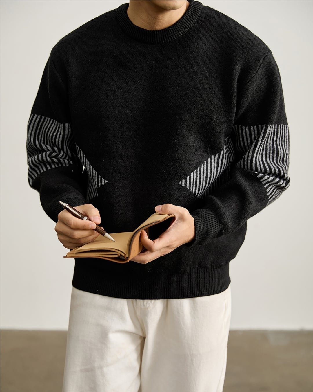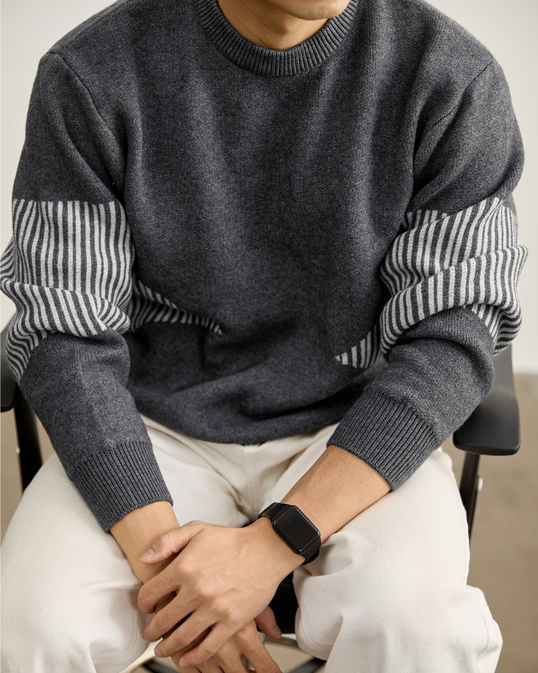 袖部分に施したストライプ調の切り替えが印象的なクルーネックニット。