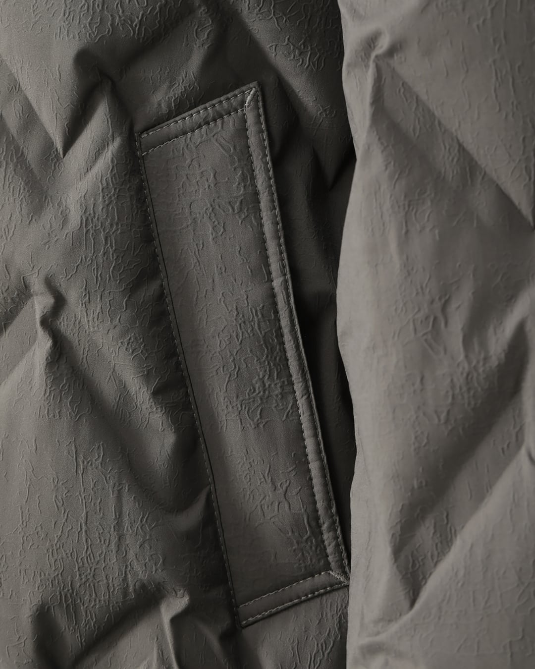 ダイヤ柄が目を引く、スタイリッシュなショート丈ダウンジャケット。