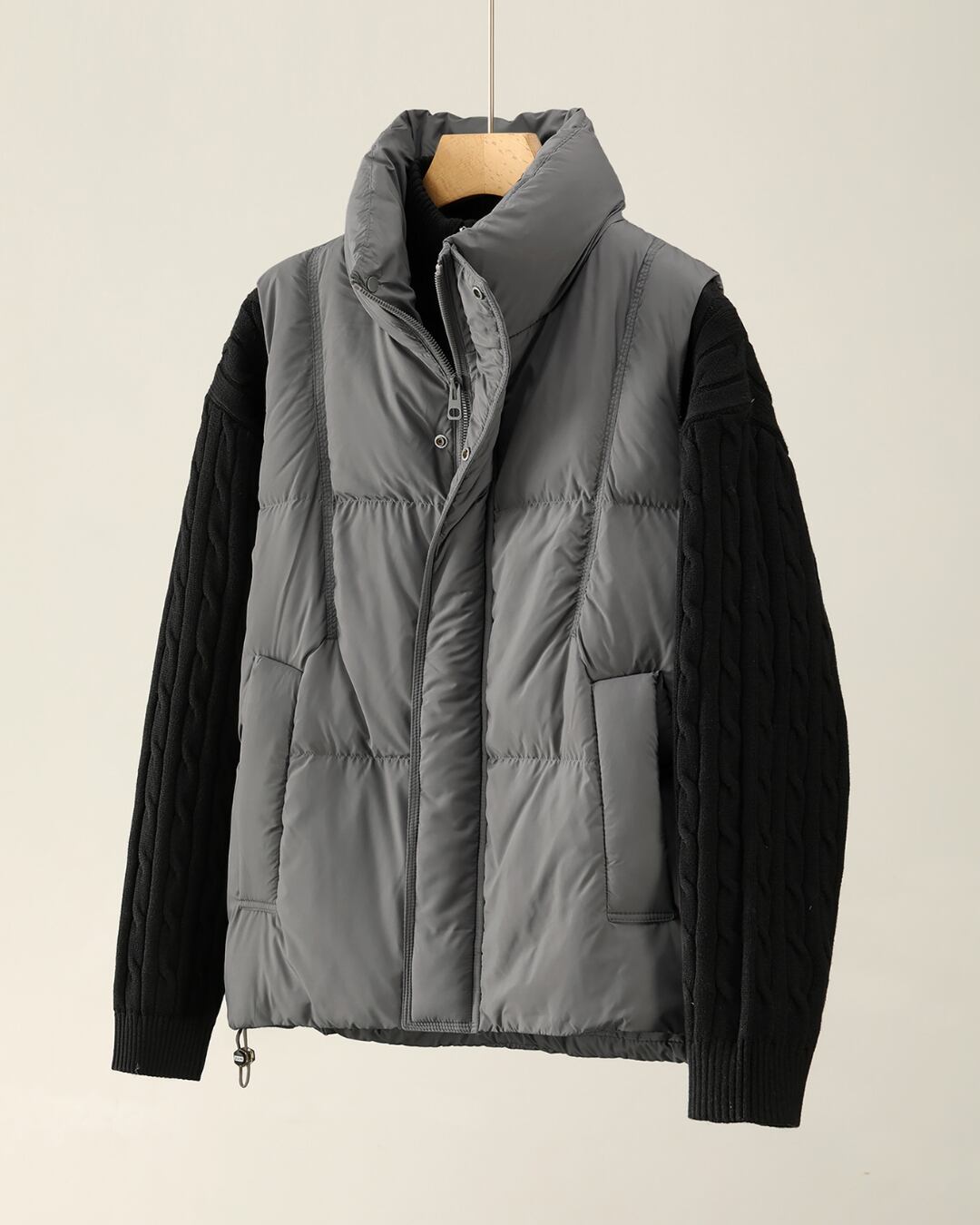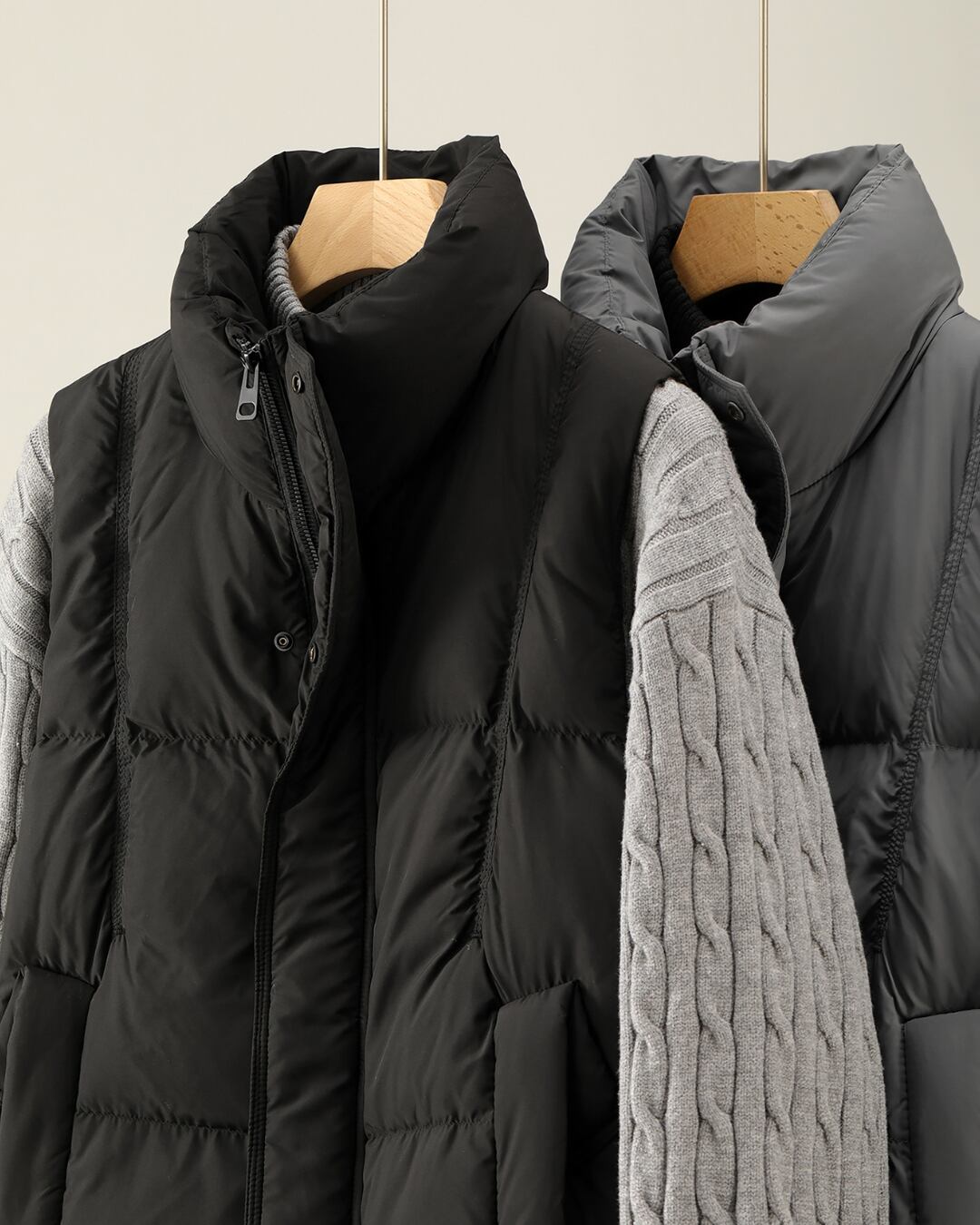 首元まで暖かいスタンドネックデザインの中綿ベスト。