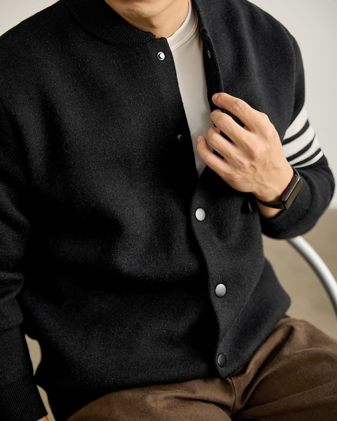 袖のラインがアクセントになり、カジュアルながらも洗練された印象を与えます。