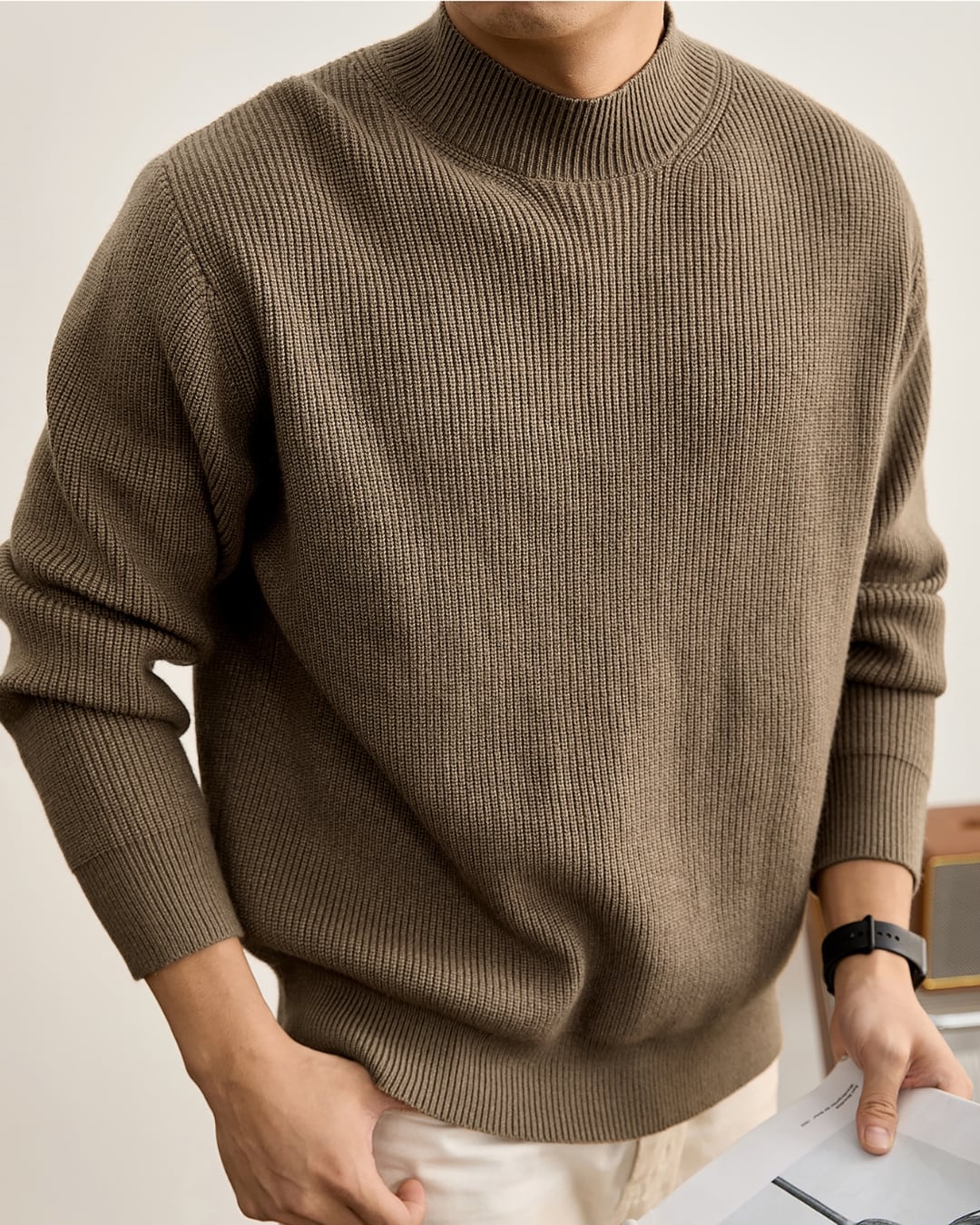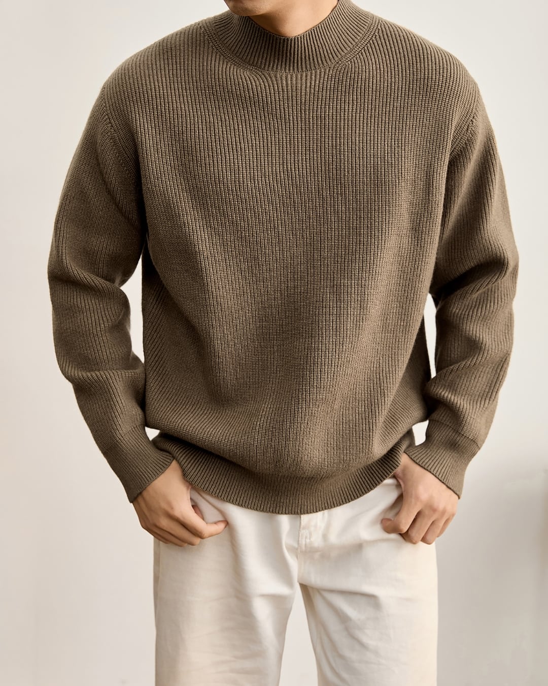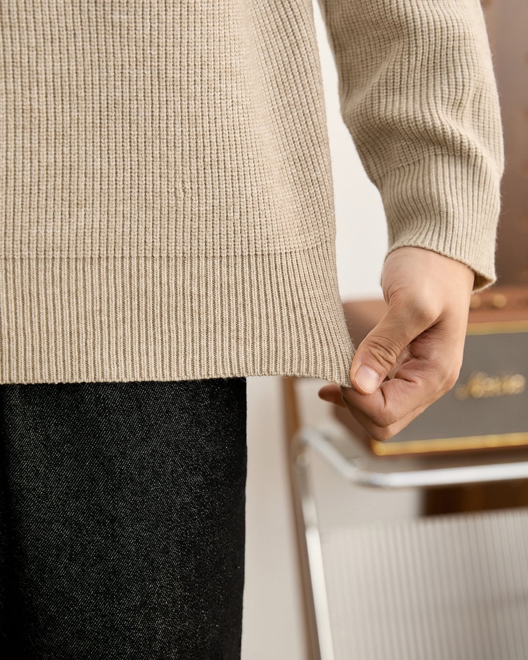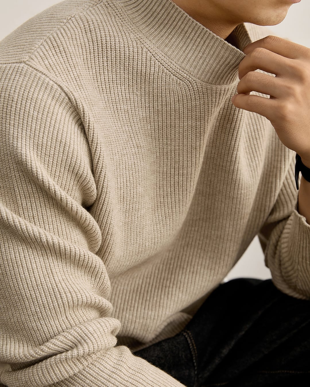リブ編みデザインの長袖ニット。