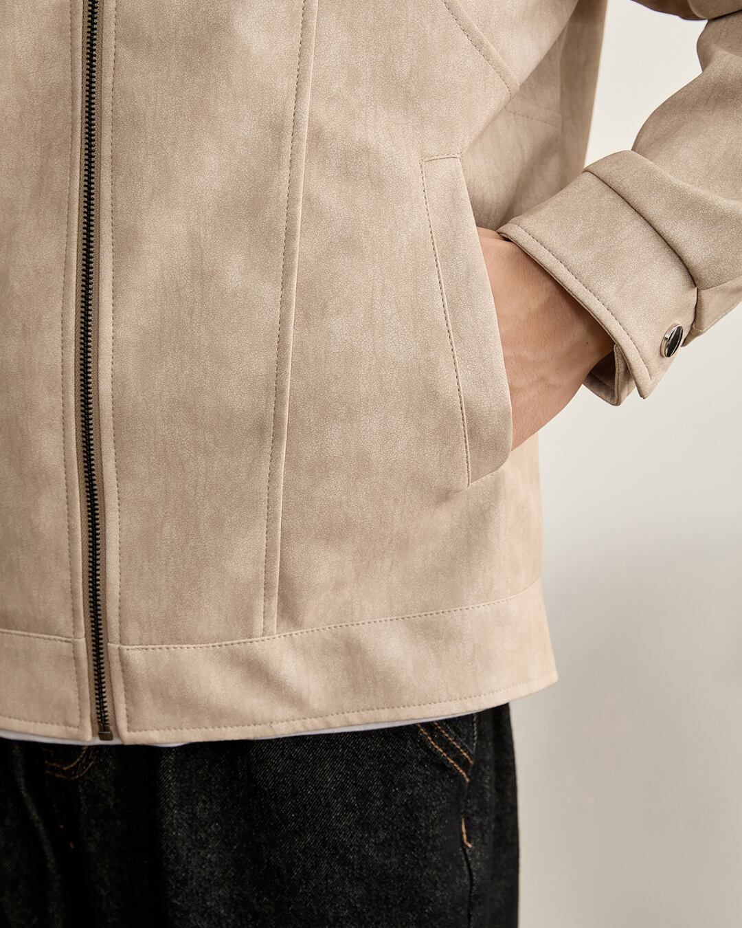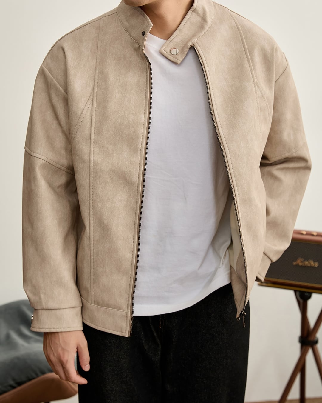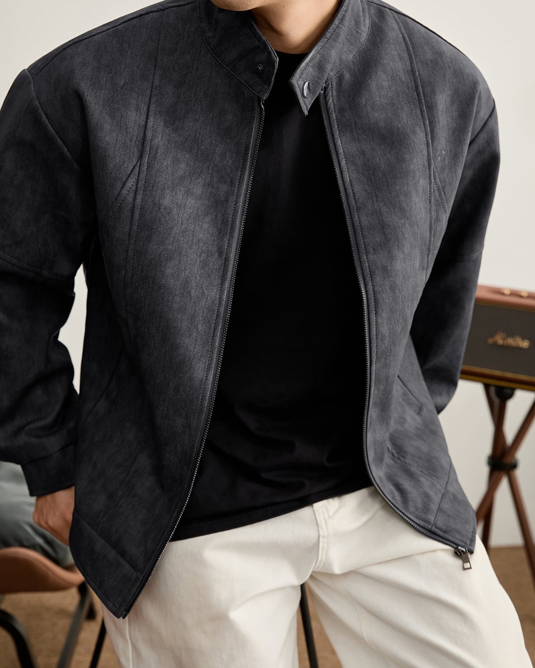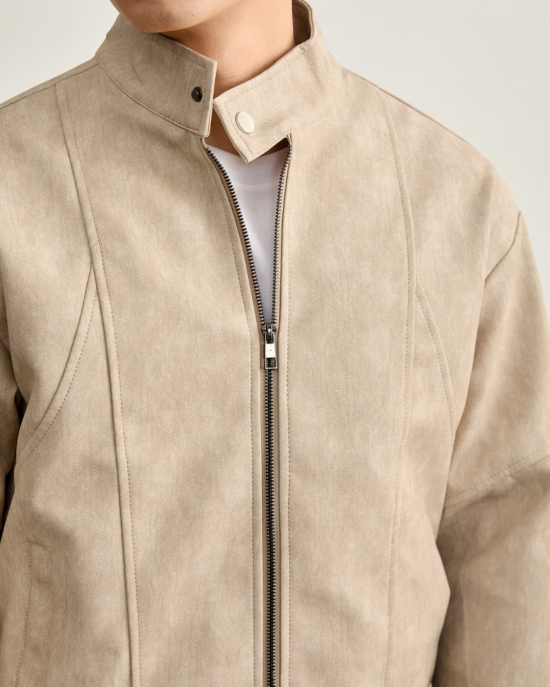 すっきりとした表情のスタンドカラージャケット。