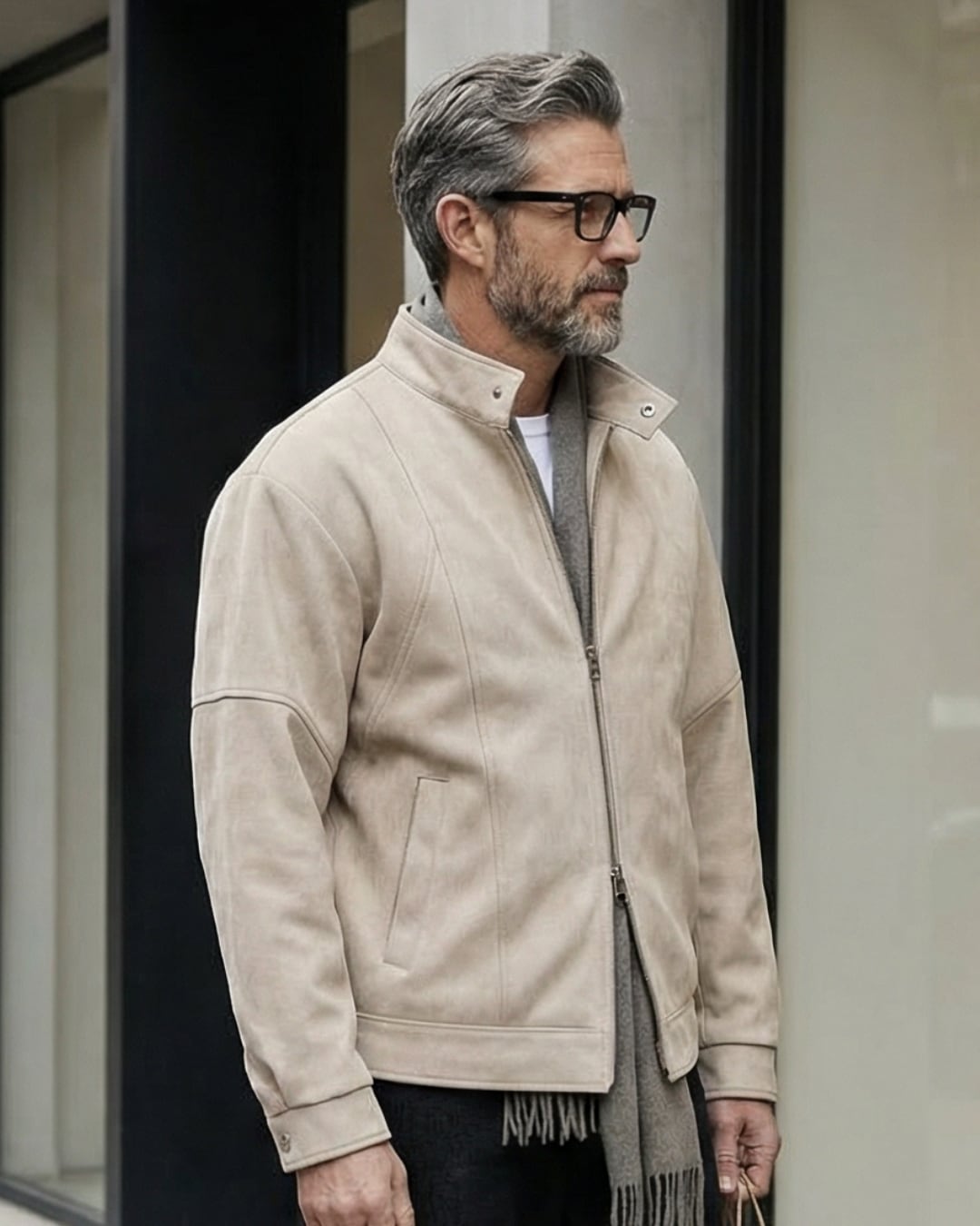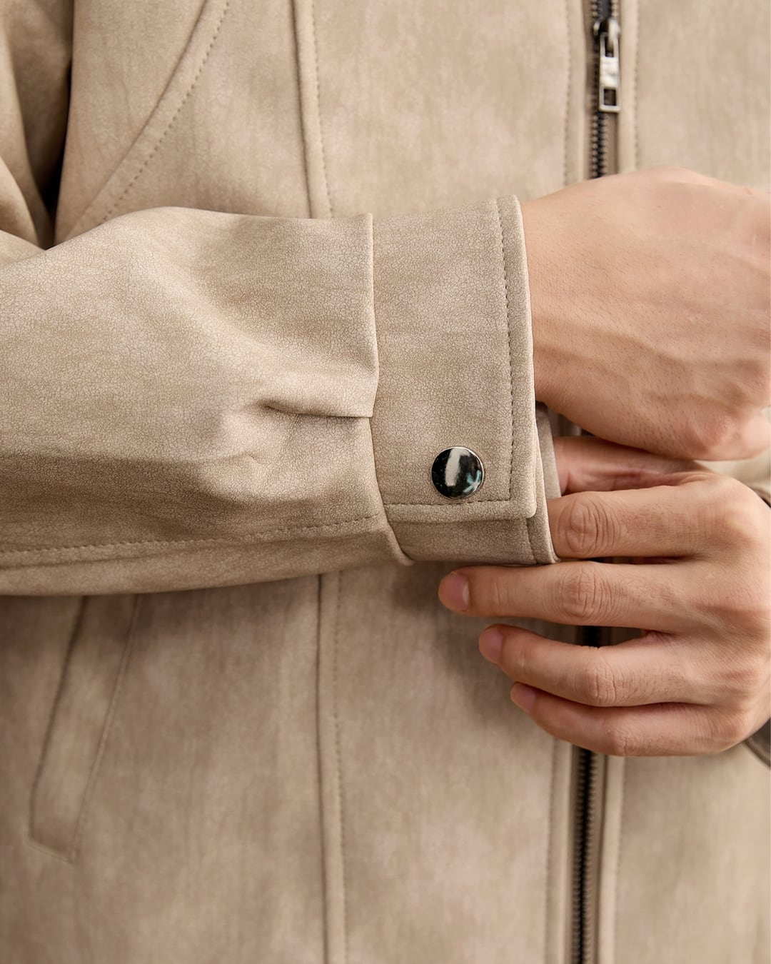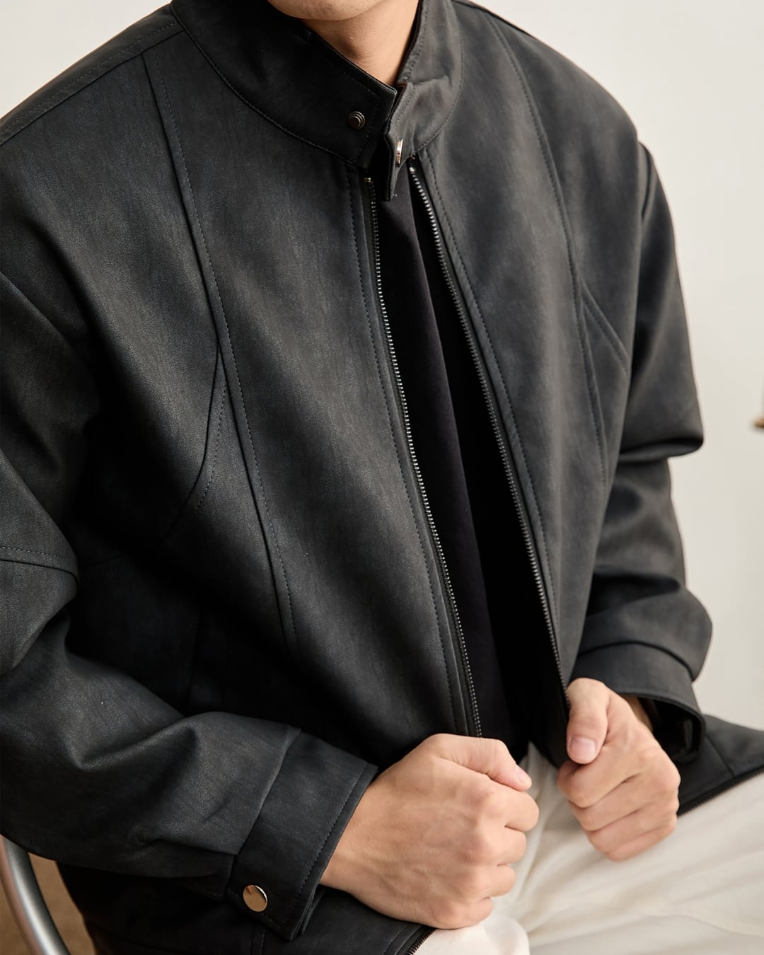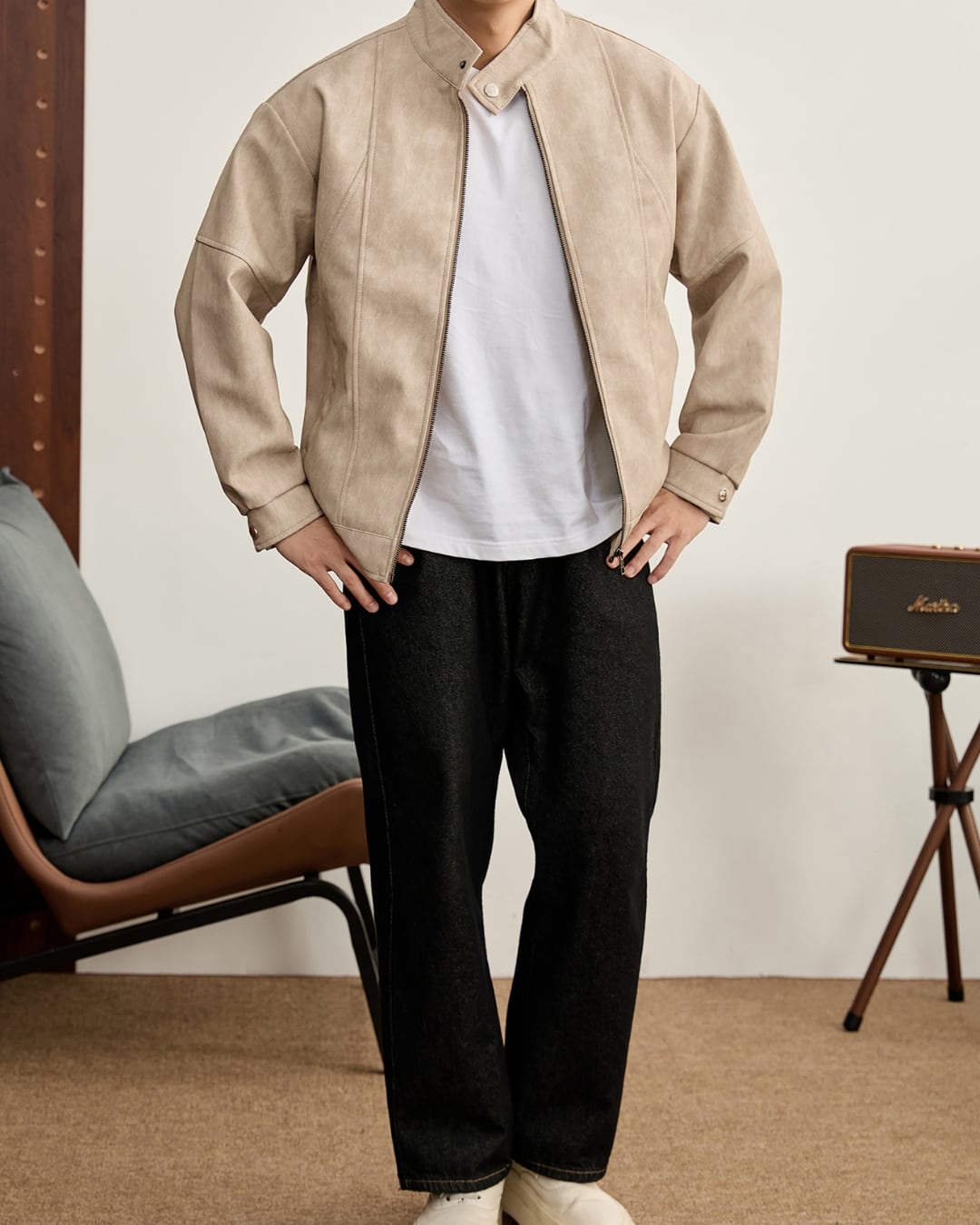 すっきりとした表情のスタンドカラージャケット。