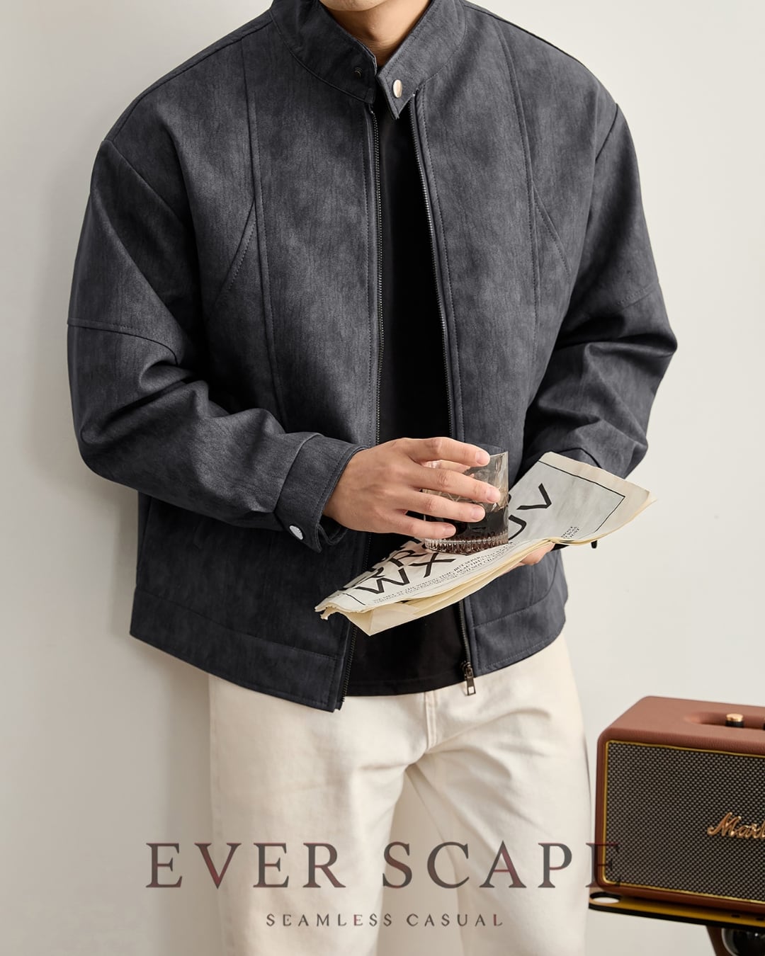 【ミニマルな佇まいが映える、スタンドカラージャケット】