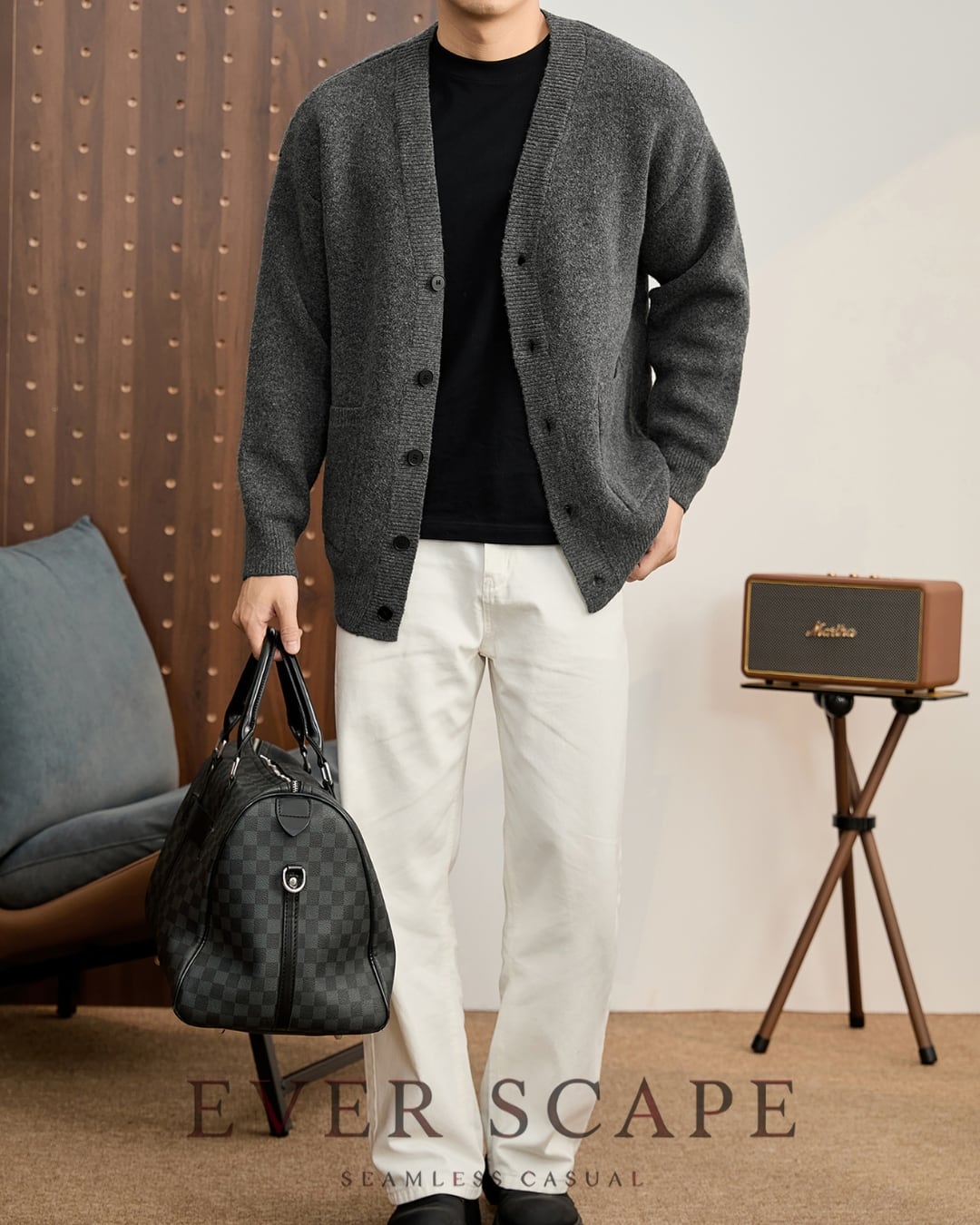 シンプルなデザインで着回し力抜群のニットカーディガン。