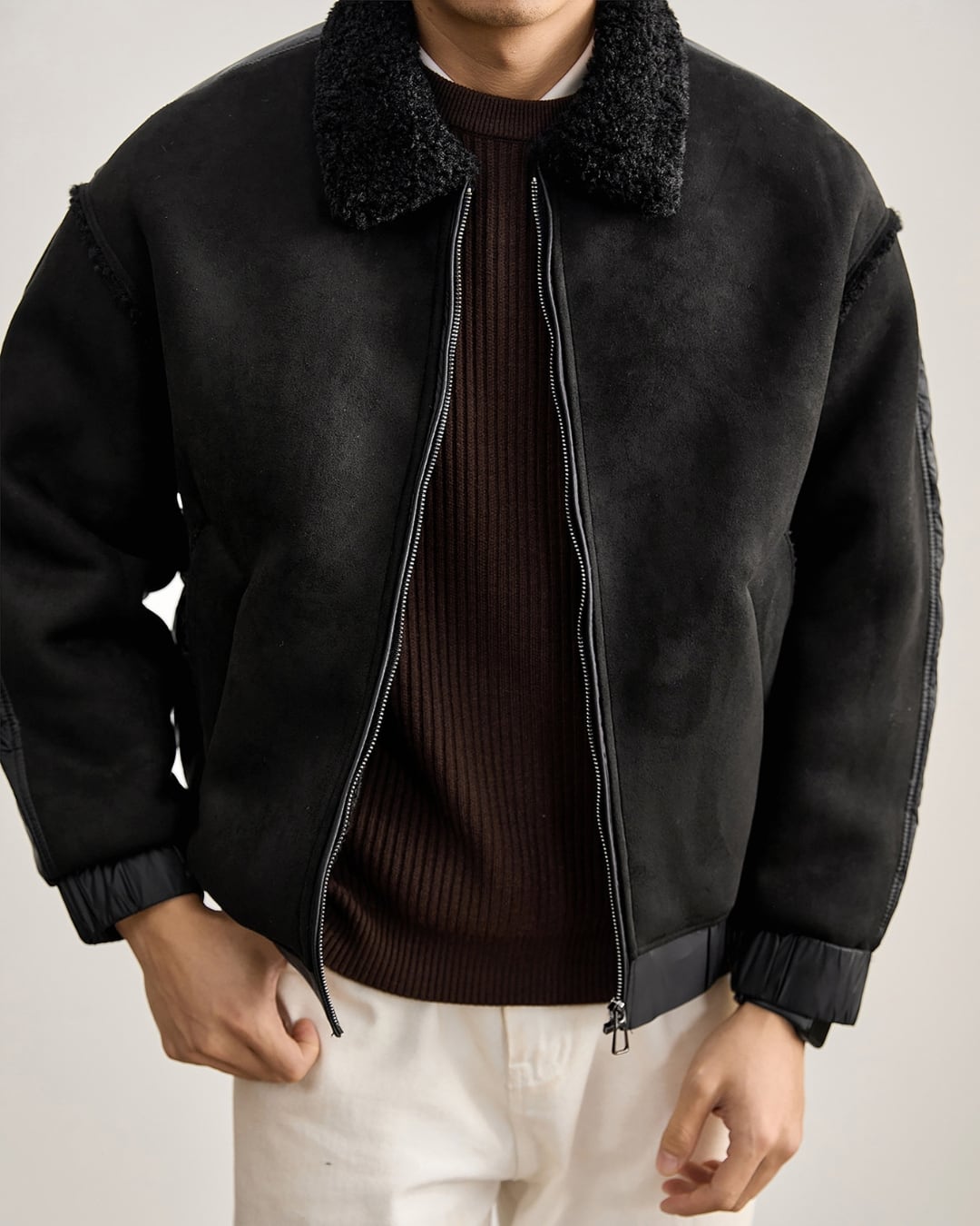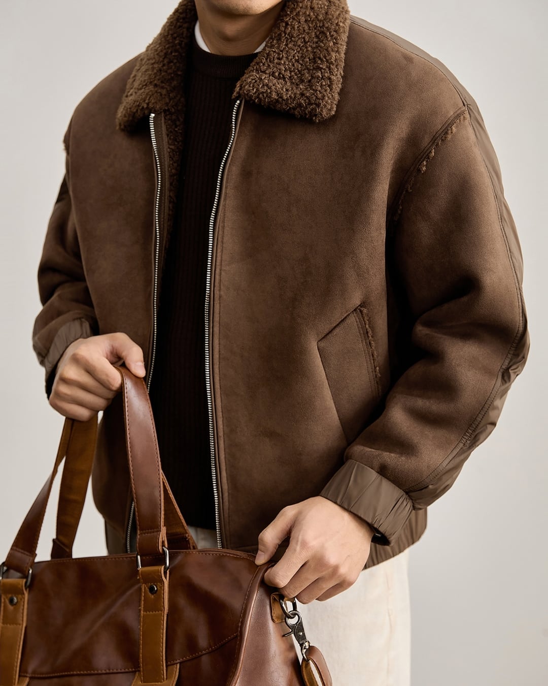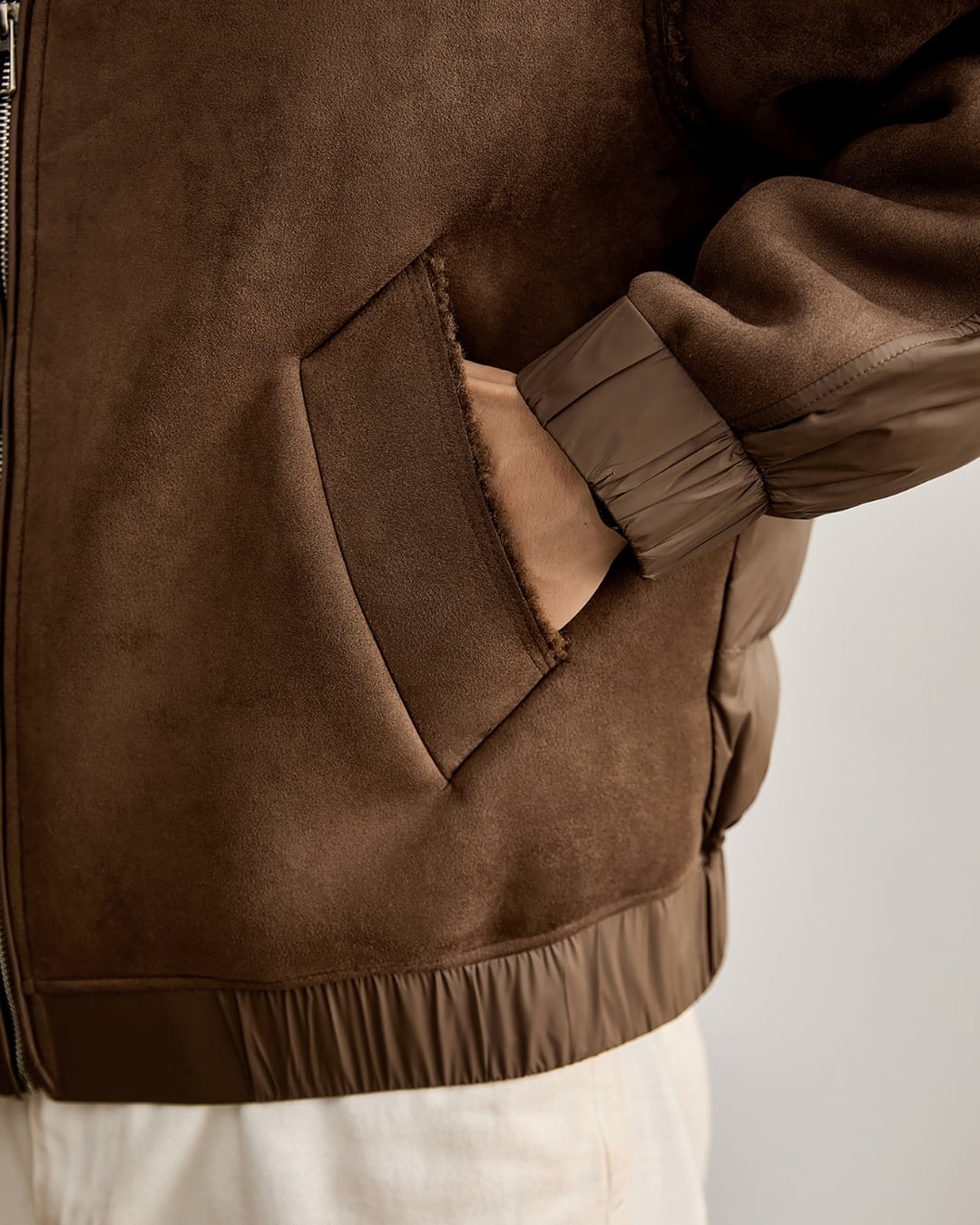 前はスウェード素材、後ろが中綿ジャケット素材のジャケット。