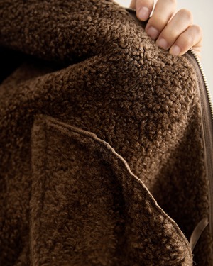 暖かみのあるボア襟が特徴的な、ジップアップジャケット。
