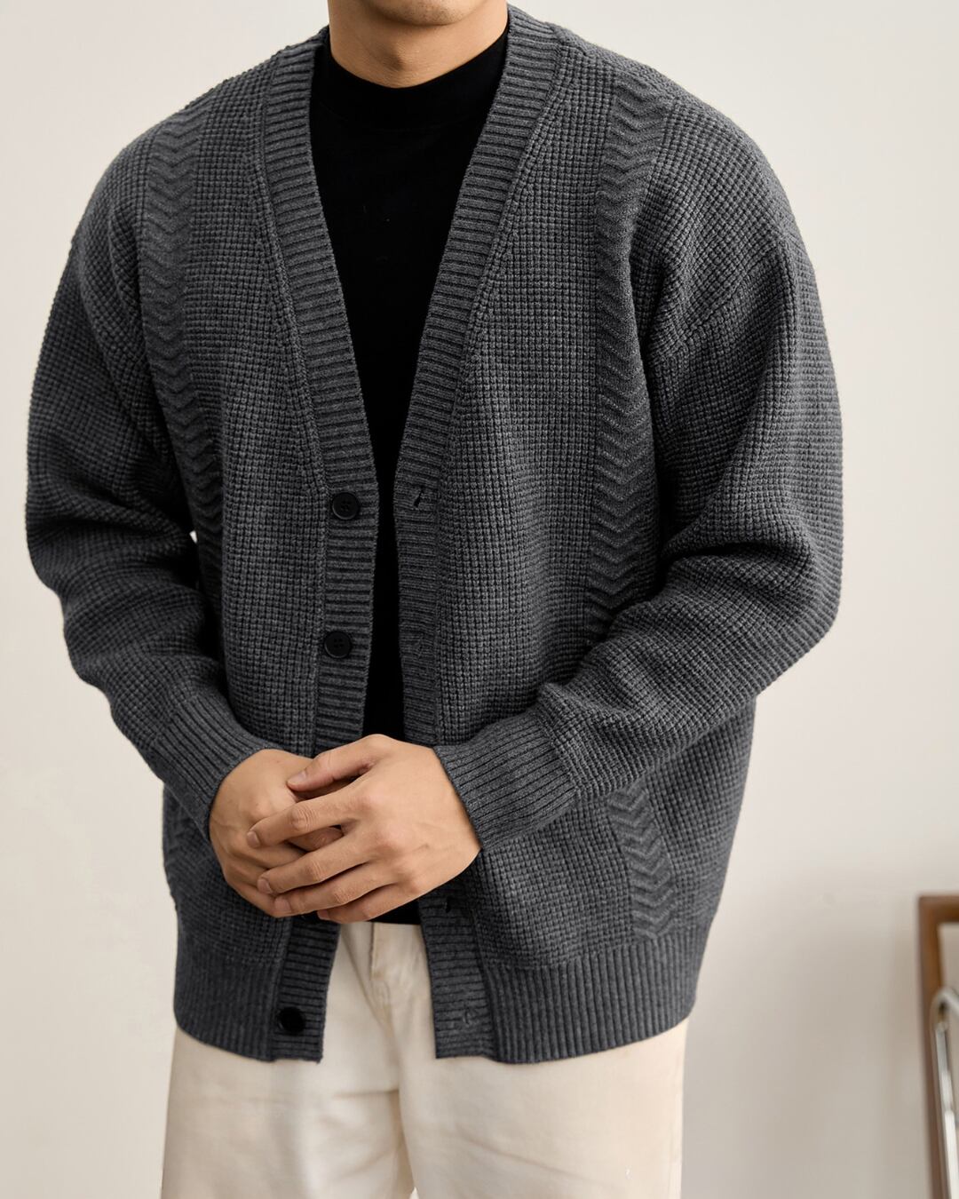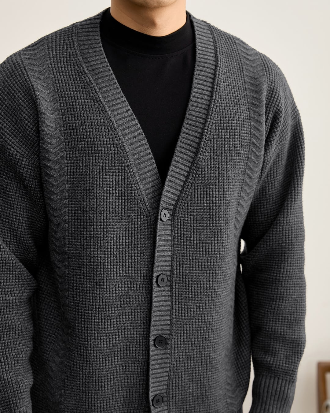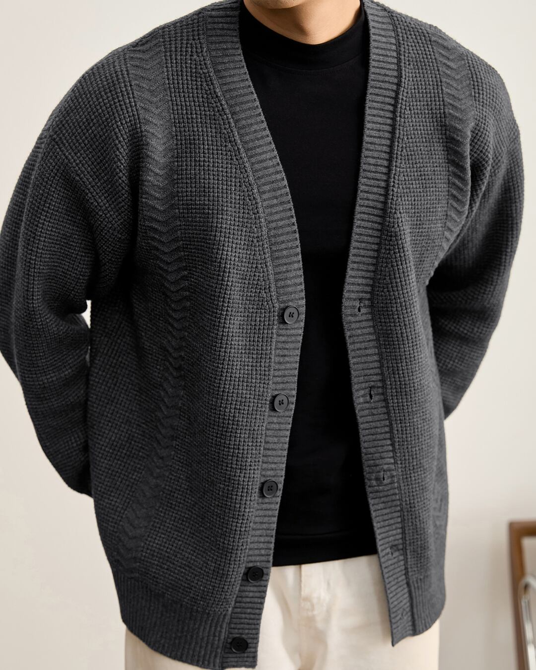 凹凸感のある編み柄を組み合わせた、立体的な表情が特徴のニットカーディガン。