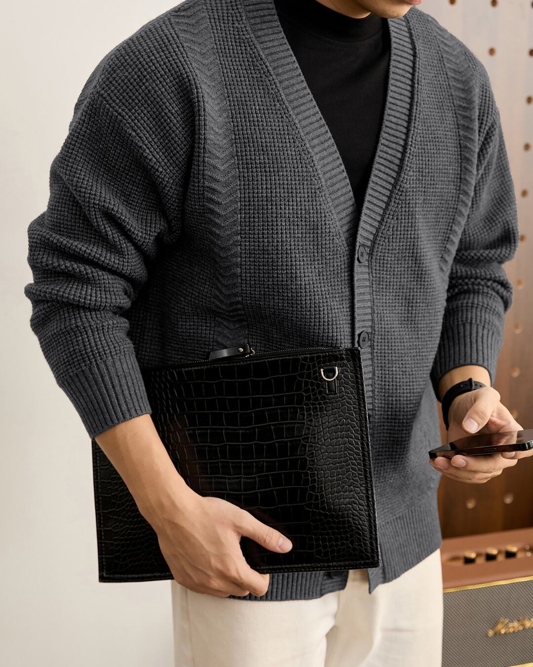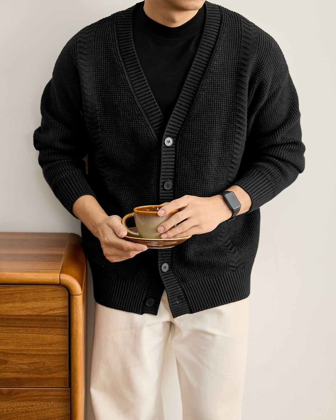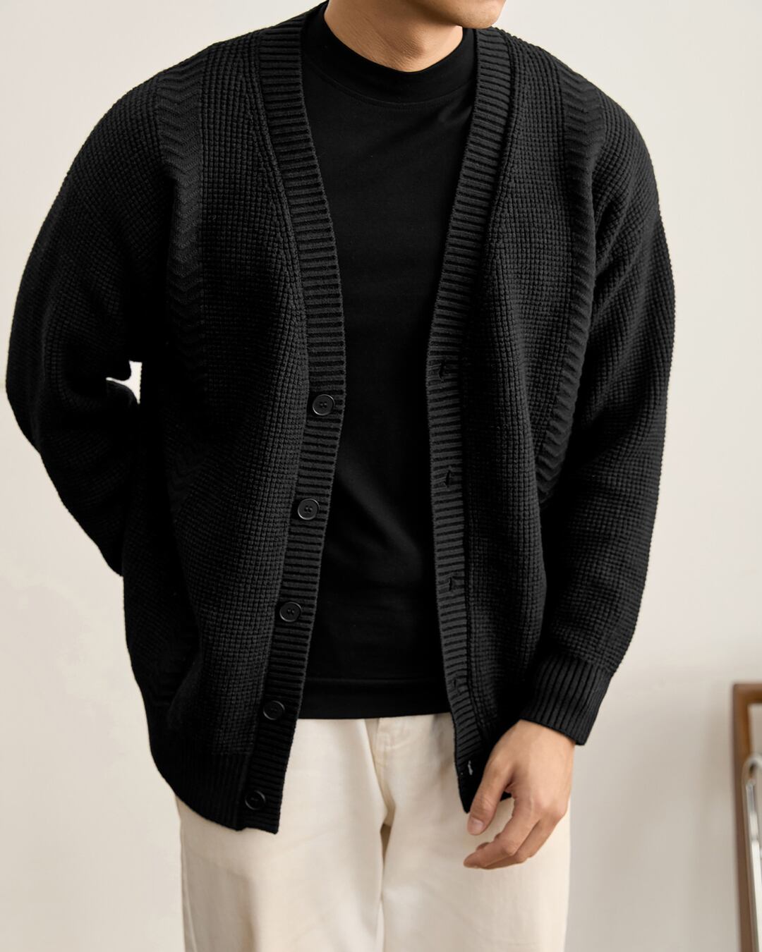 凹凸感のある編み柄を組み合わせた、立体的な表情が特徴のニットカーディガン。