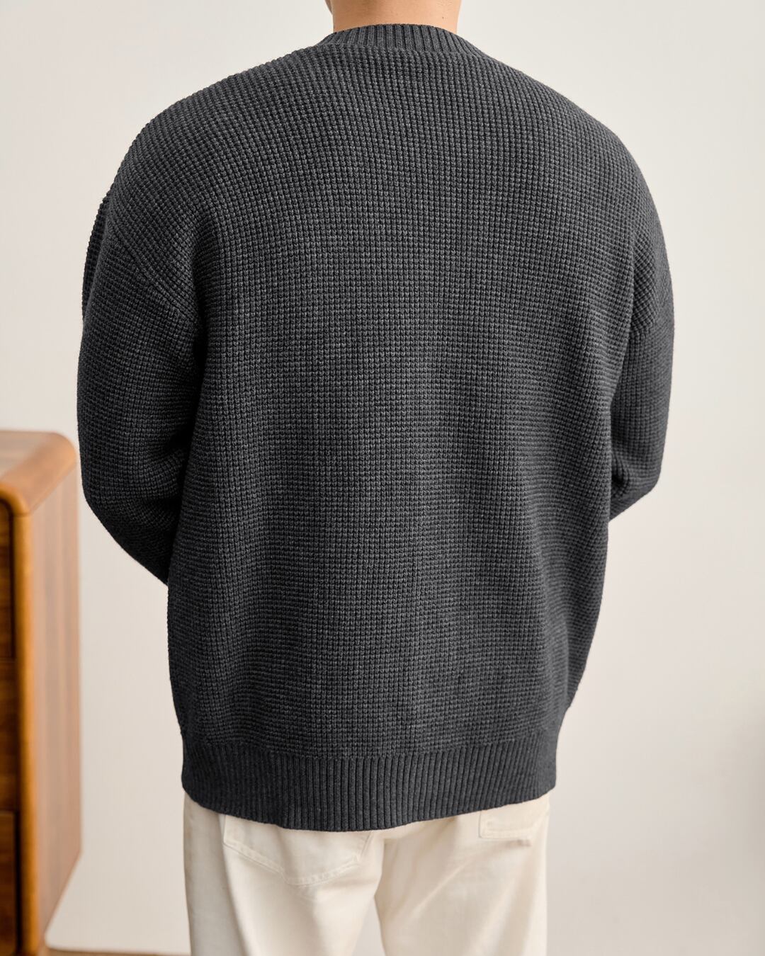 シンプルなVネックデザインに、編み地の切り替えがさりげないアクセントを添えています。