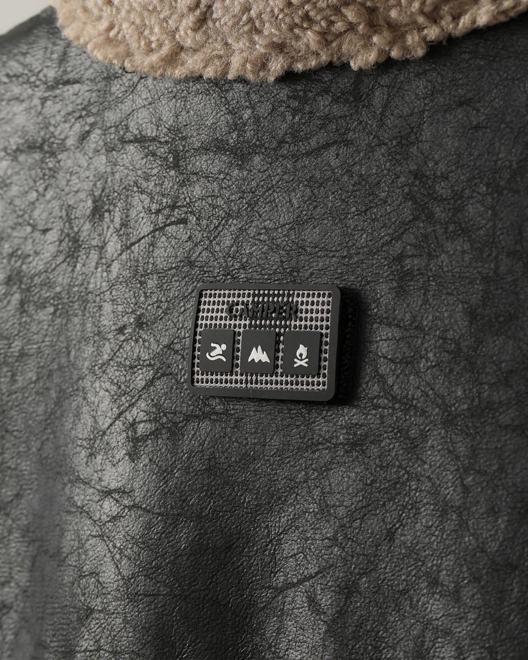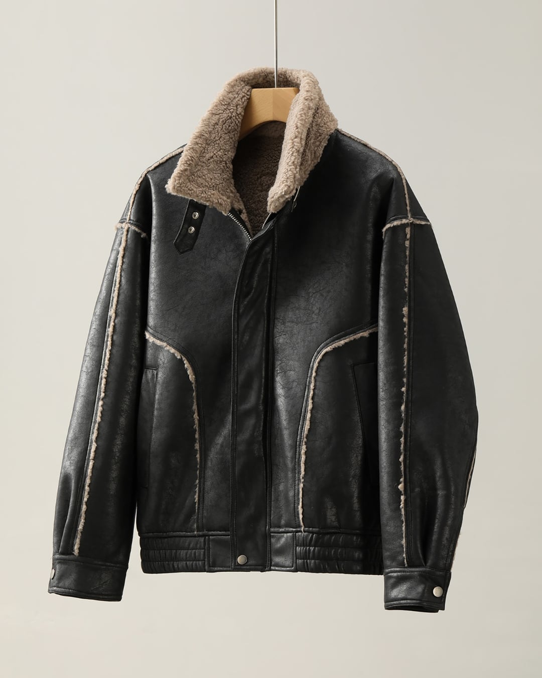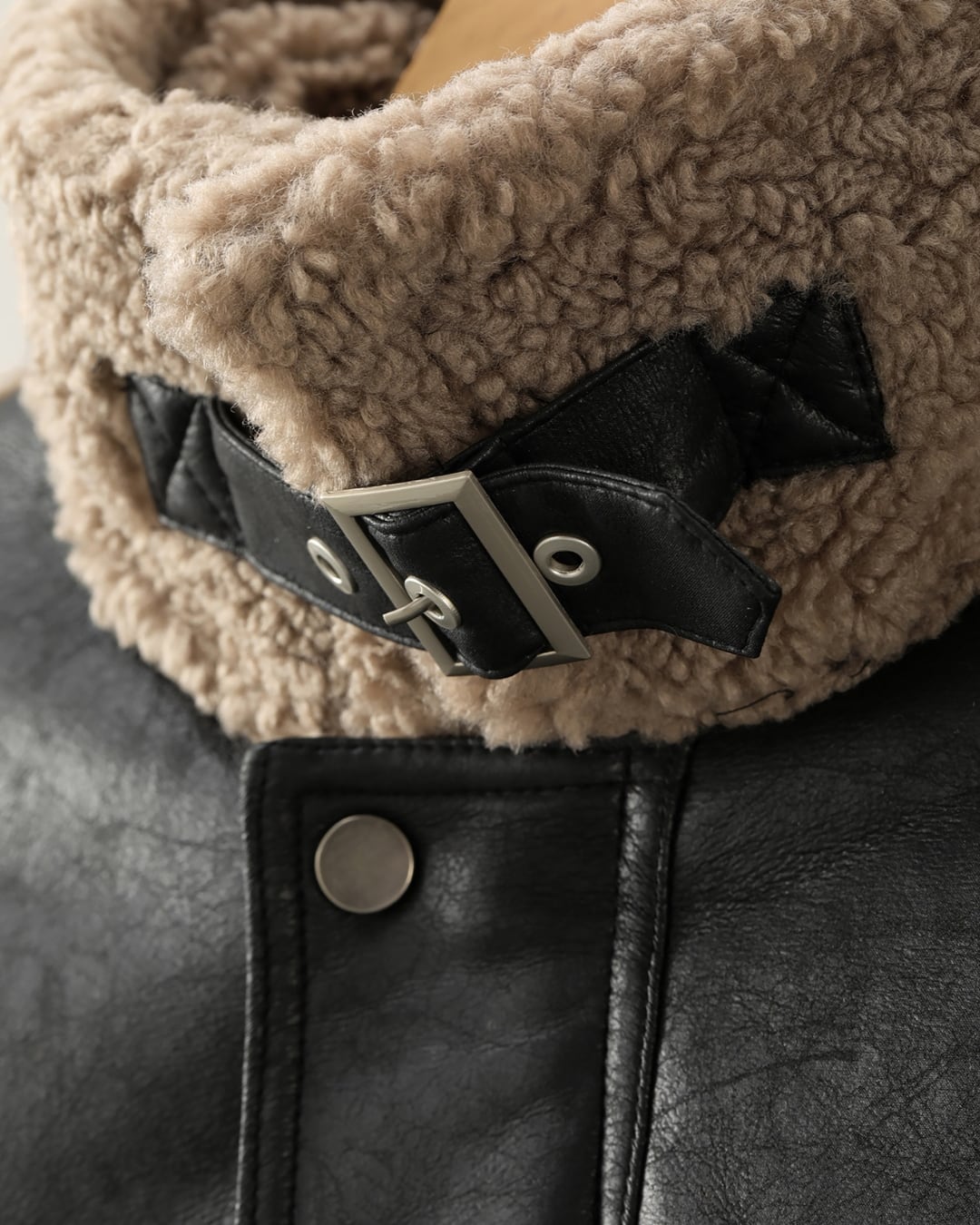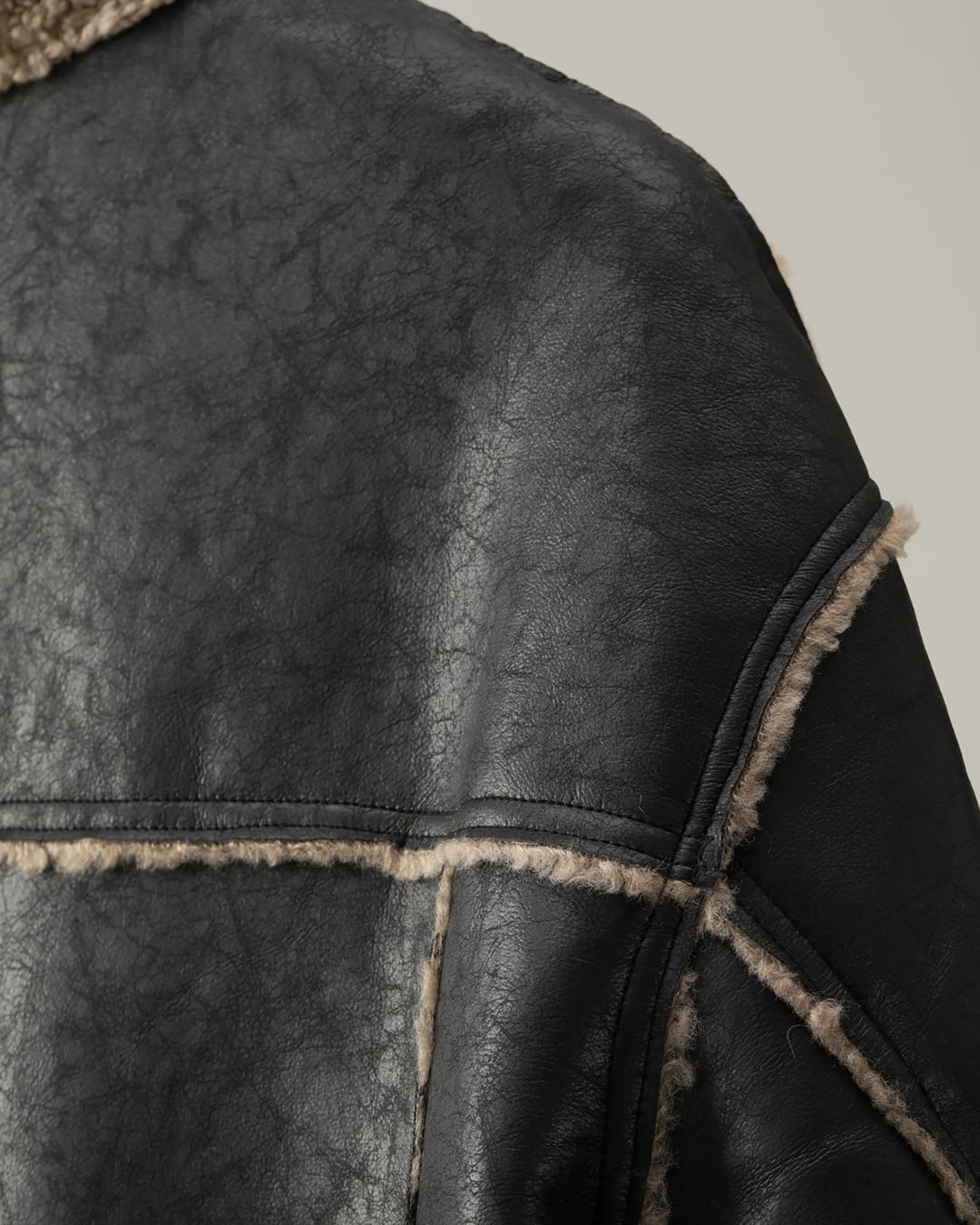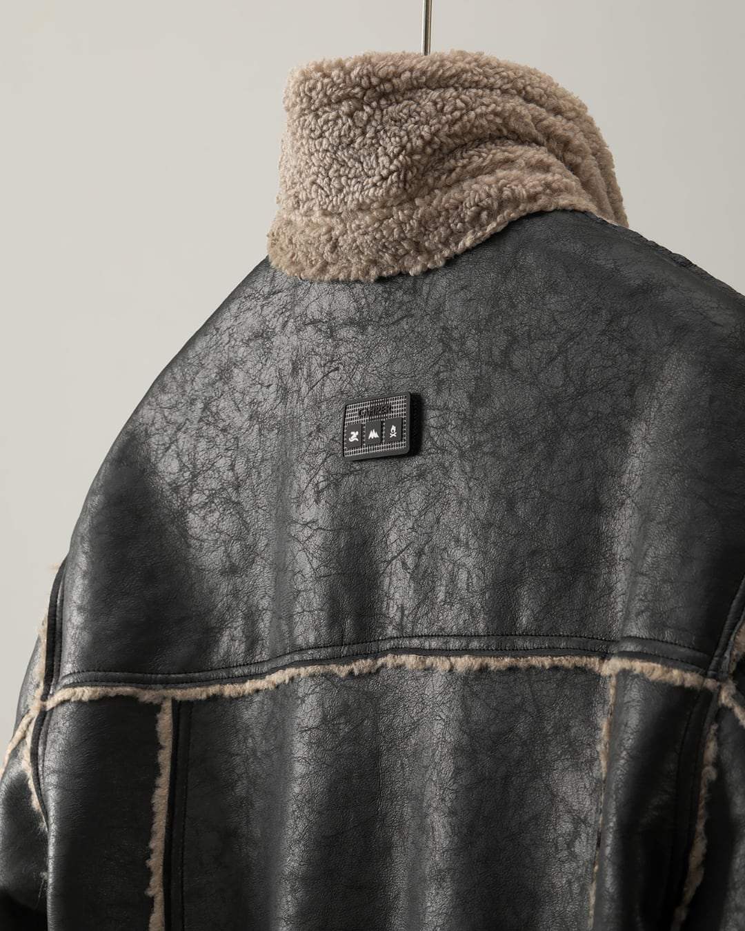 レザー調の質感がスタイリングを引き締めつつ、ボア仕様により見た目にも暖かみのある一着に仕上げています。