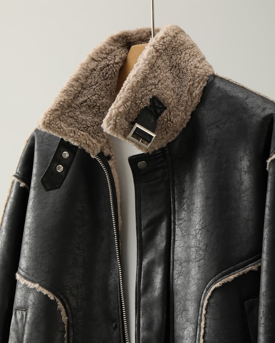 表地にフェイクレザーを使用し、内側と襟元にボアをあしらった存在感のあるライダースジャケット。