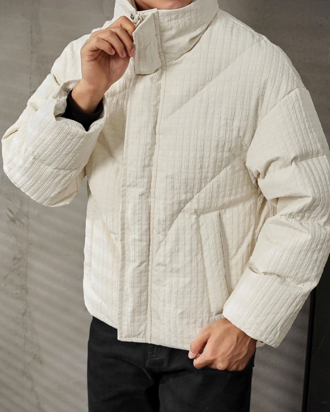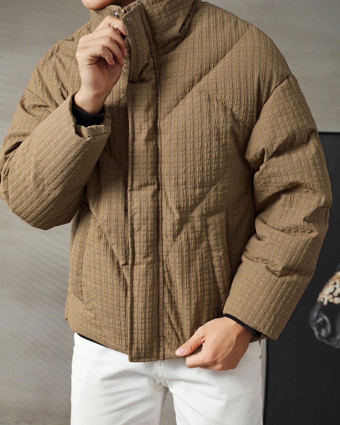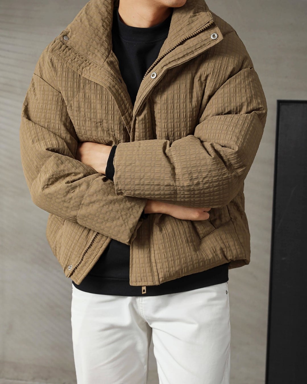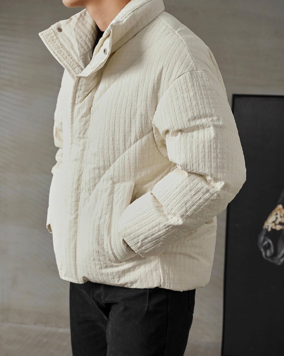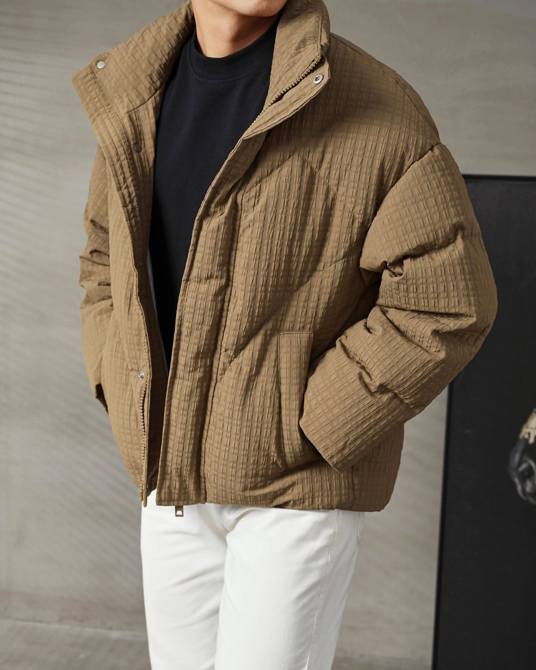 凹凸感のあるポリエステル素材を使用した、立体的な表情が魅力のダウンジャケット。