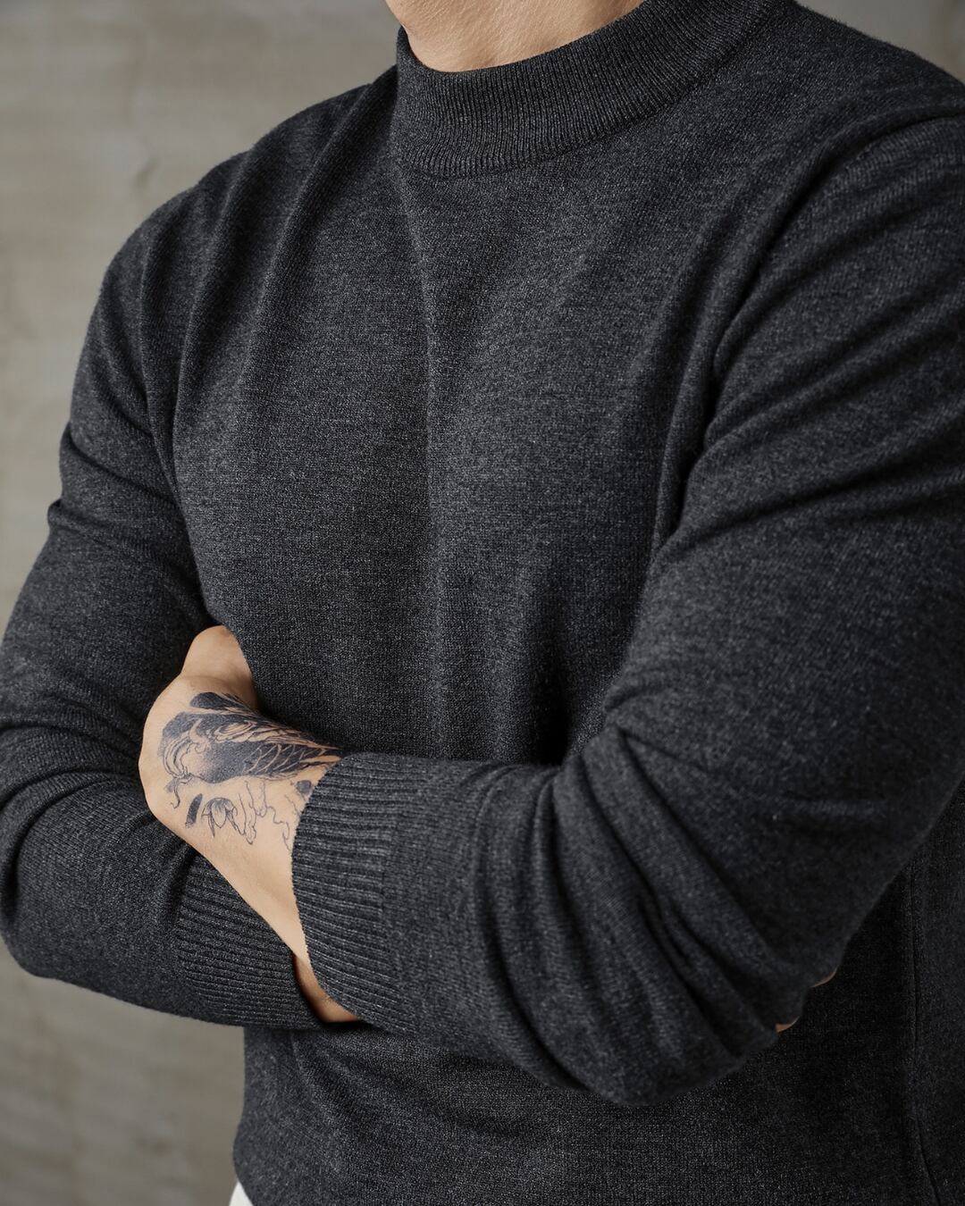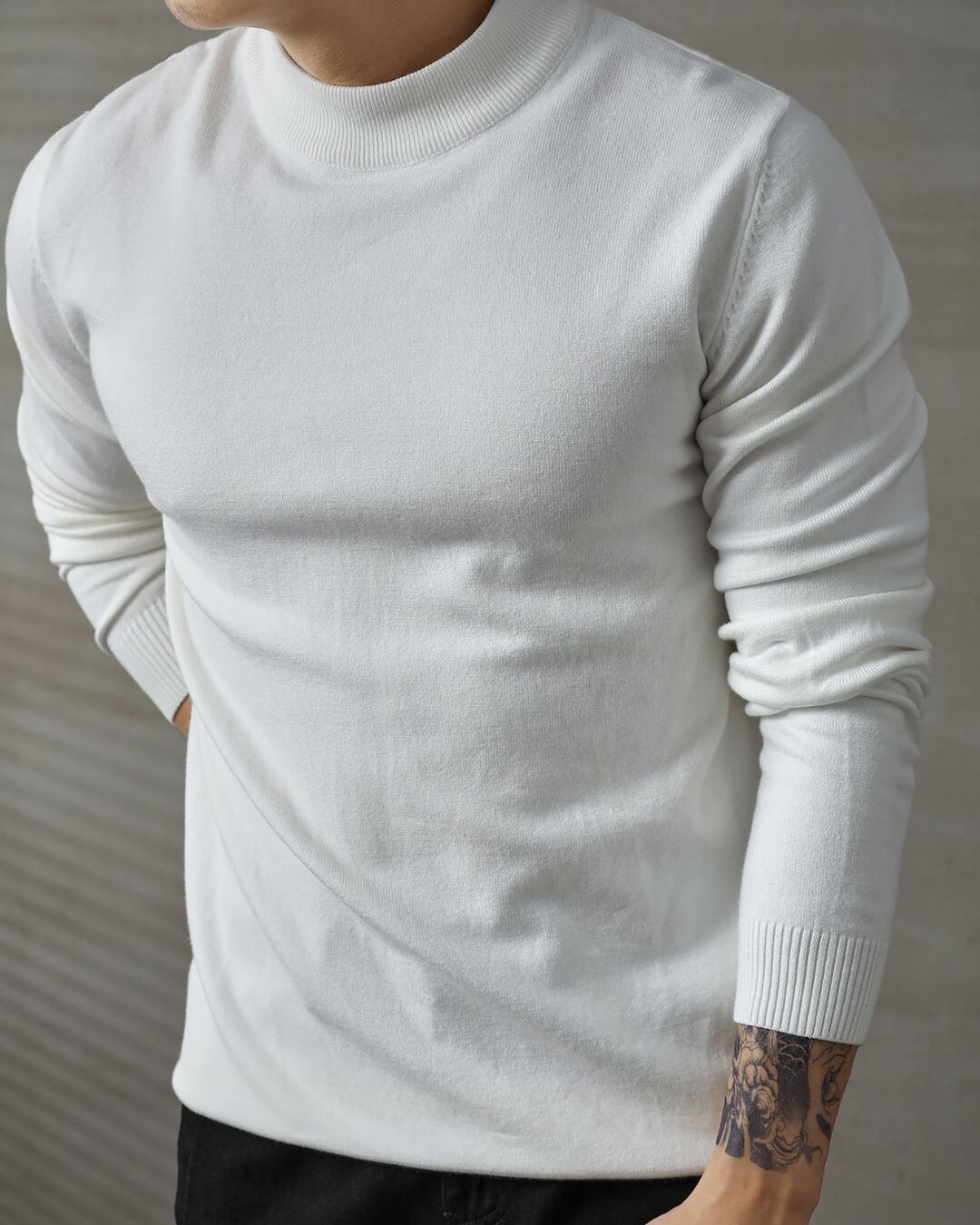 程よく立ち上がるネックラインが特徴の、ミニマルなニットトップス。