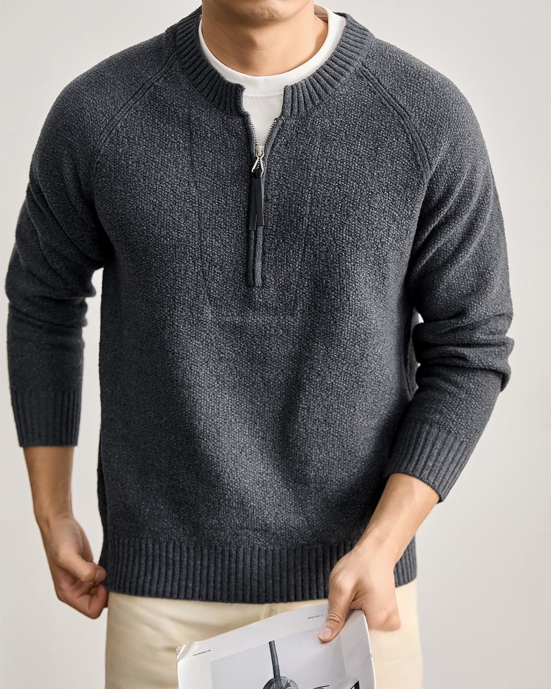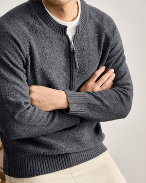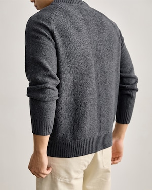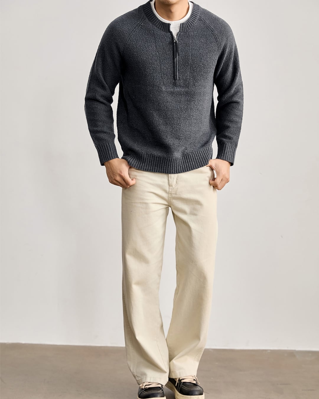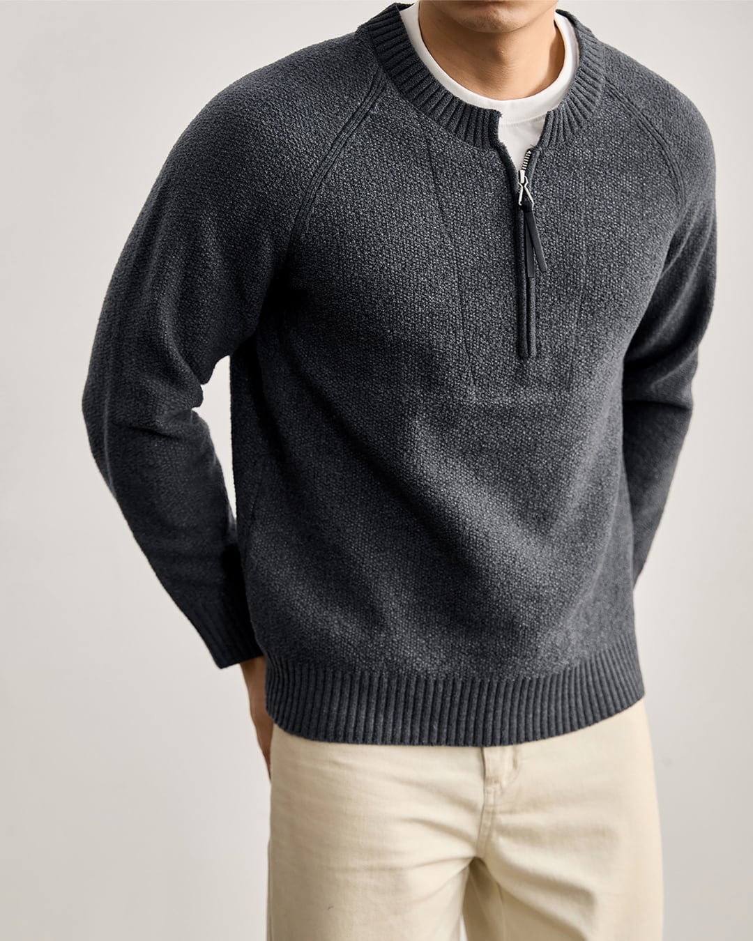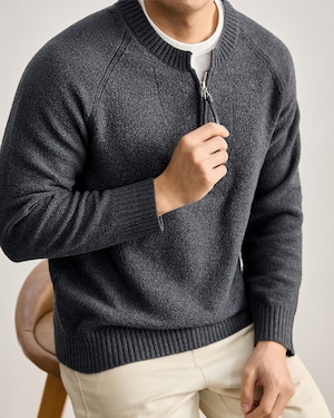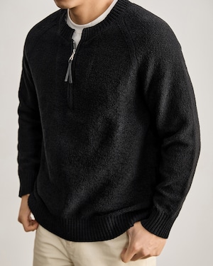 首元はハーフジップ仕様で、開き具合によって印象を調整できるデザイン。