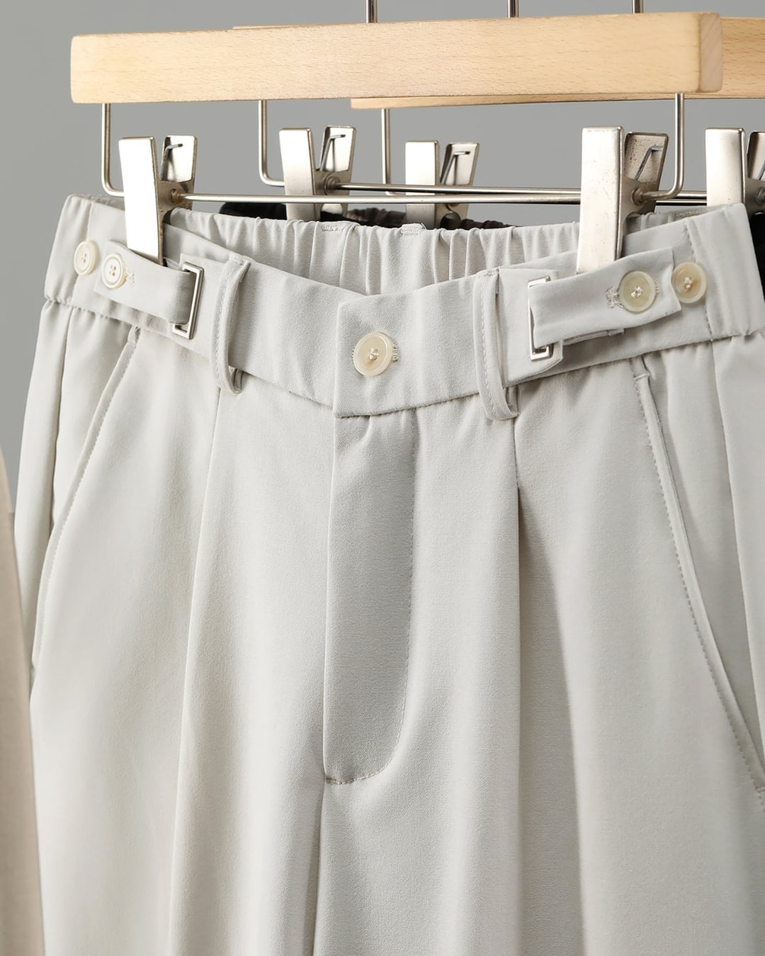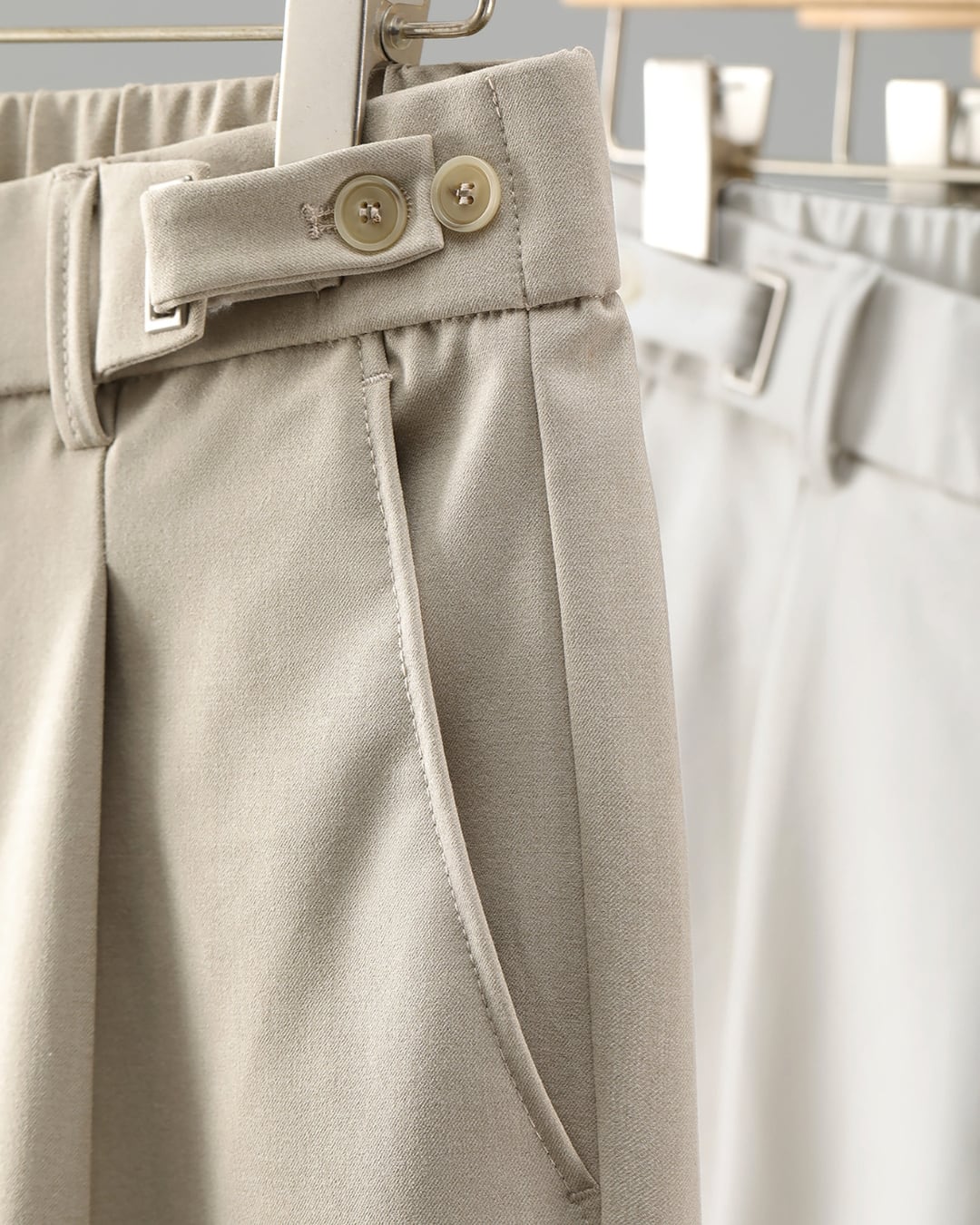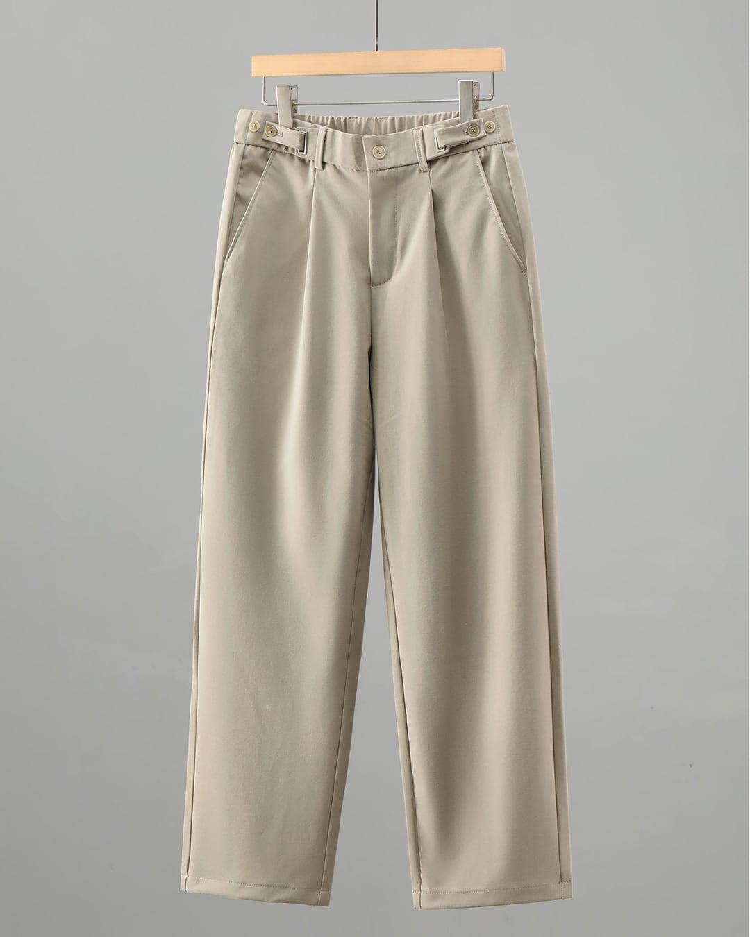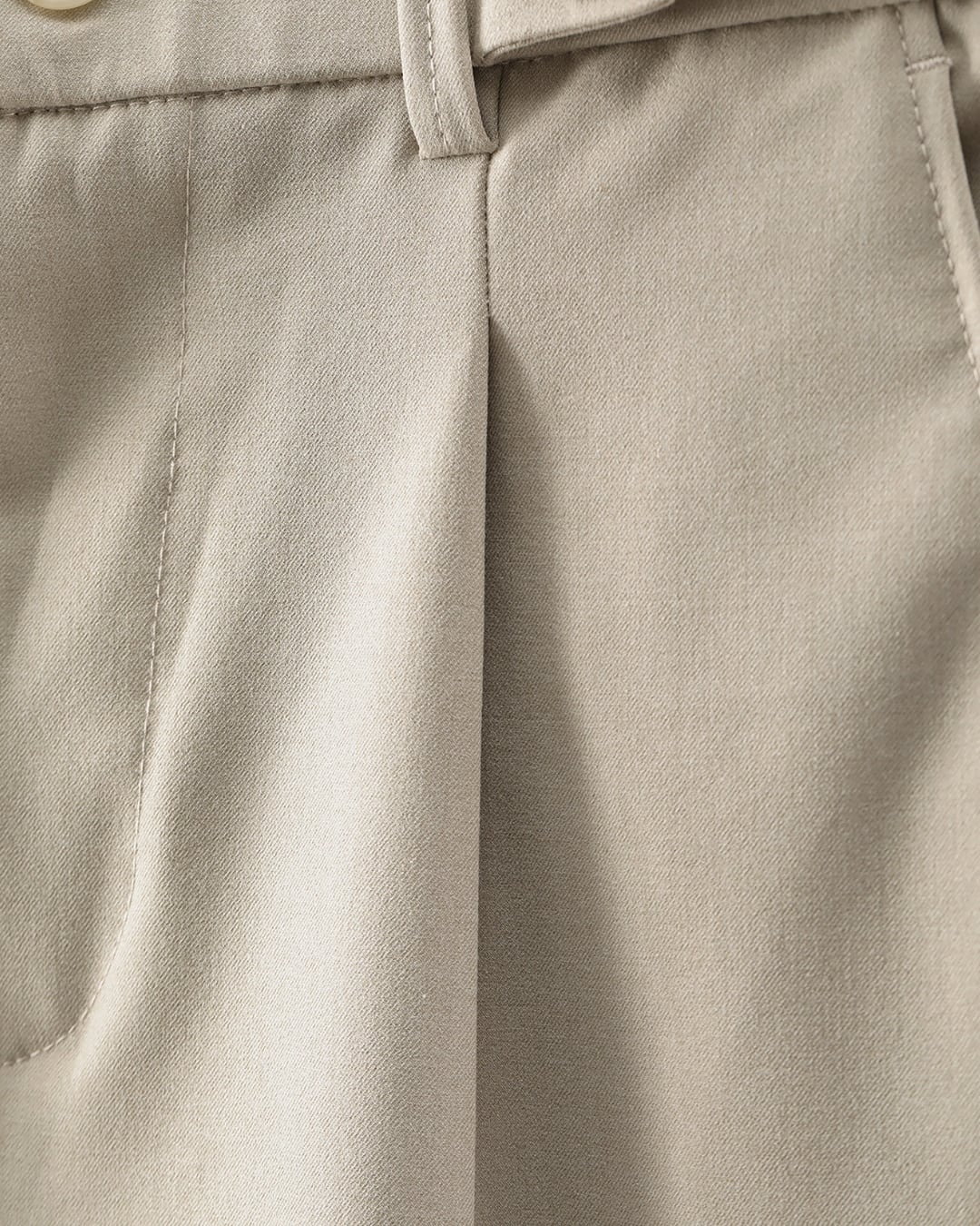 ウエスト両サイドにあしらった飾りデザインが、さりげないアクセントになる一本。ベルト機能は持たせず、ミニマルな中に表情を加えたデザインに仕上げています。