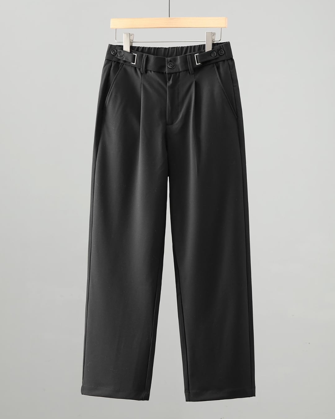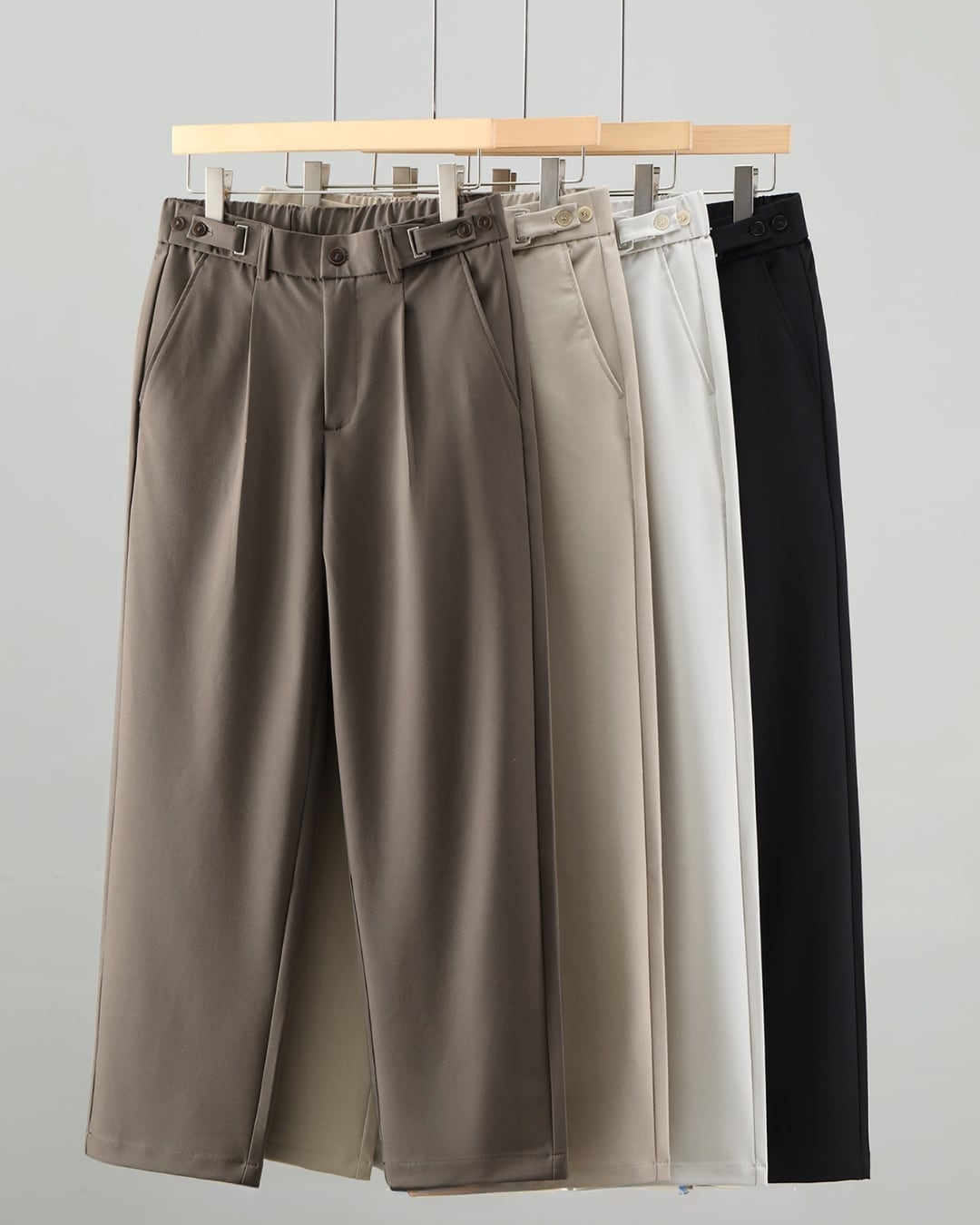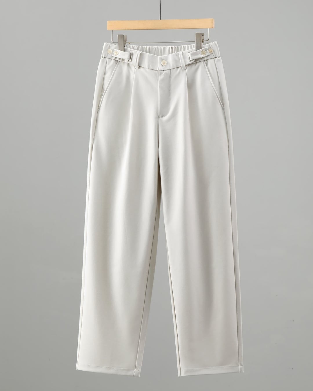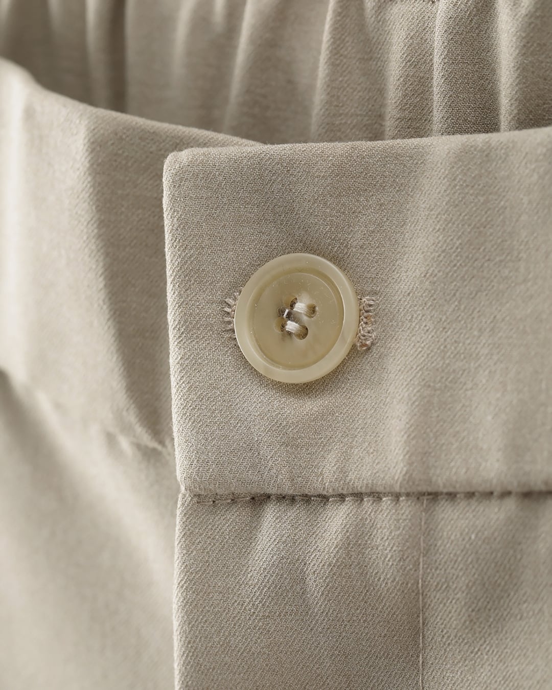ウエスト両サイドにあしらった飾りデザインが、さりげないアクセントになる一本。ベルト機能は持たせず、ミニマルな中に表情を加えたデザインに仕上げています。