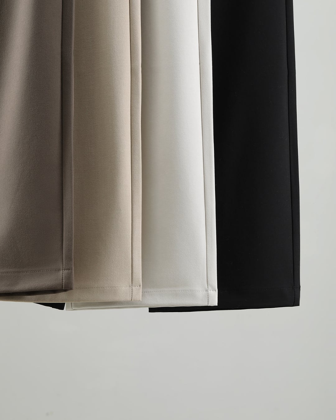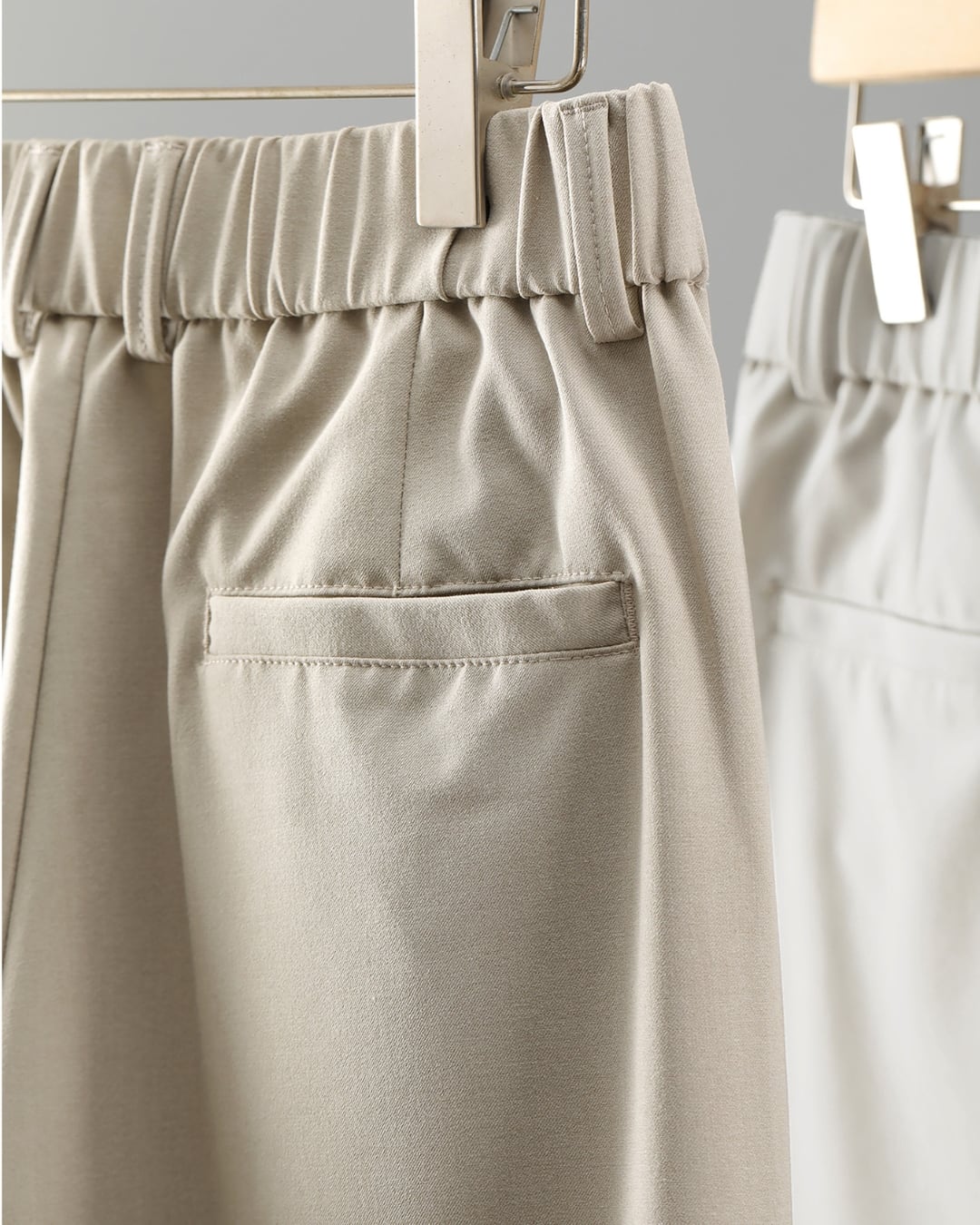 ポリエステル素材ならではの落ち感と滑らかな表情で、カジュアルにもきれいめにも対応。センタープレス入りのワイドシルエットが、脚のラインをすっきりと見せつつ、リラックスした穿き心地をキープします。