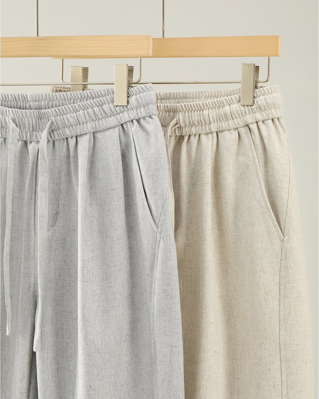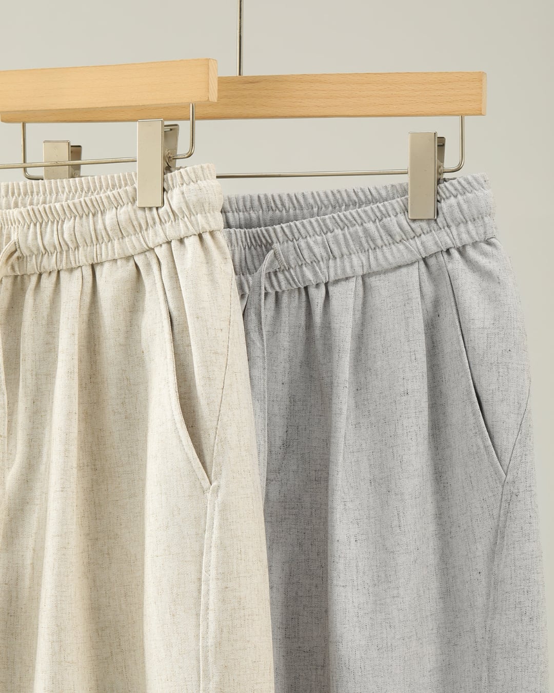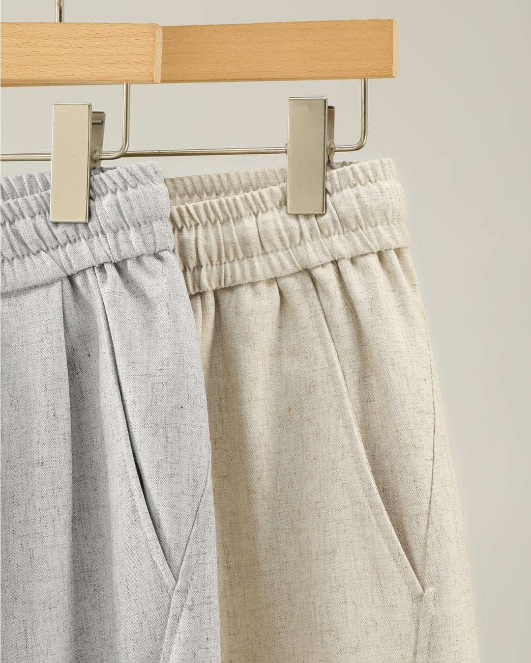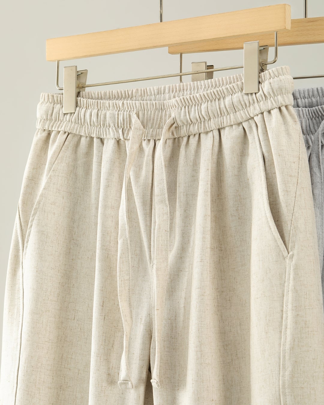 ポリエステル×リネン×スパンデックスの混紡素材で、軽さと柔らかさ、動きやすさをバランス良く兼ね備えています。