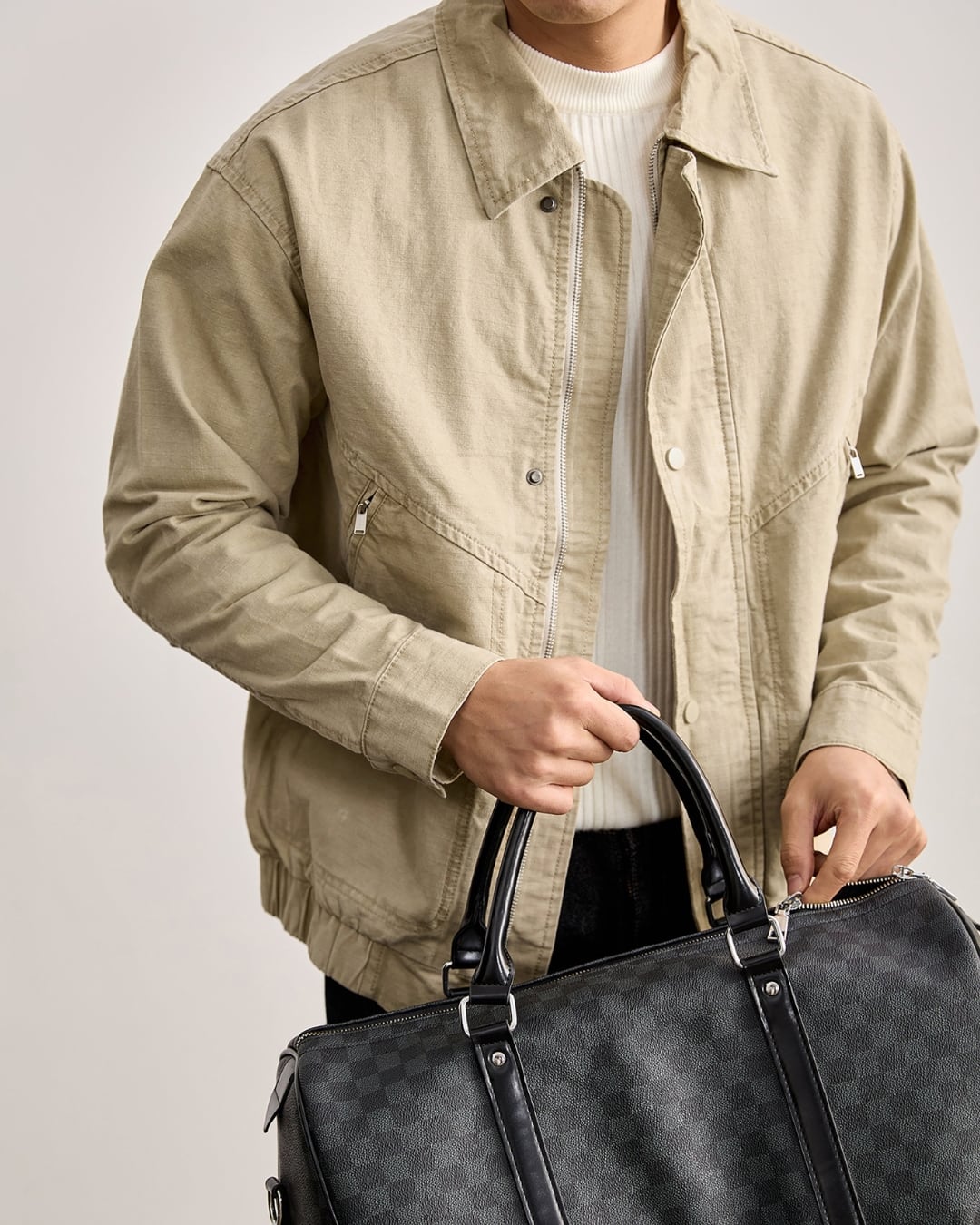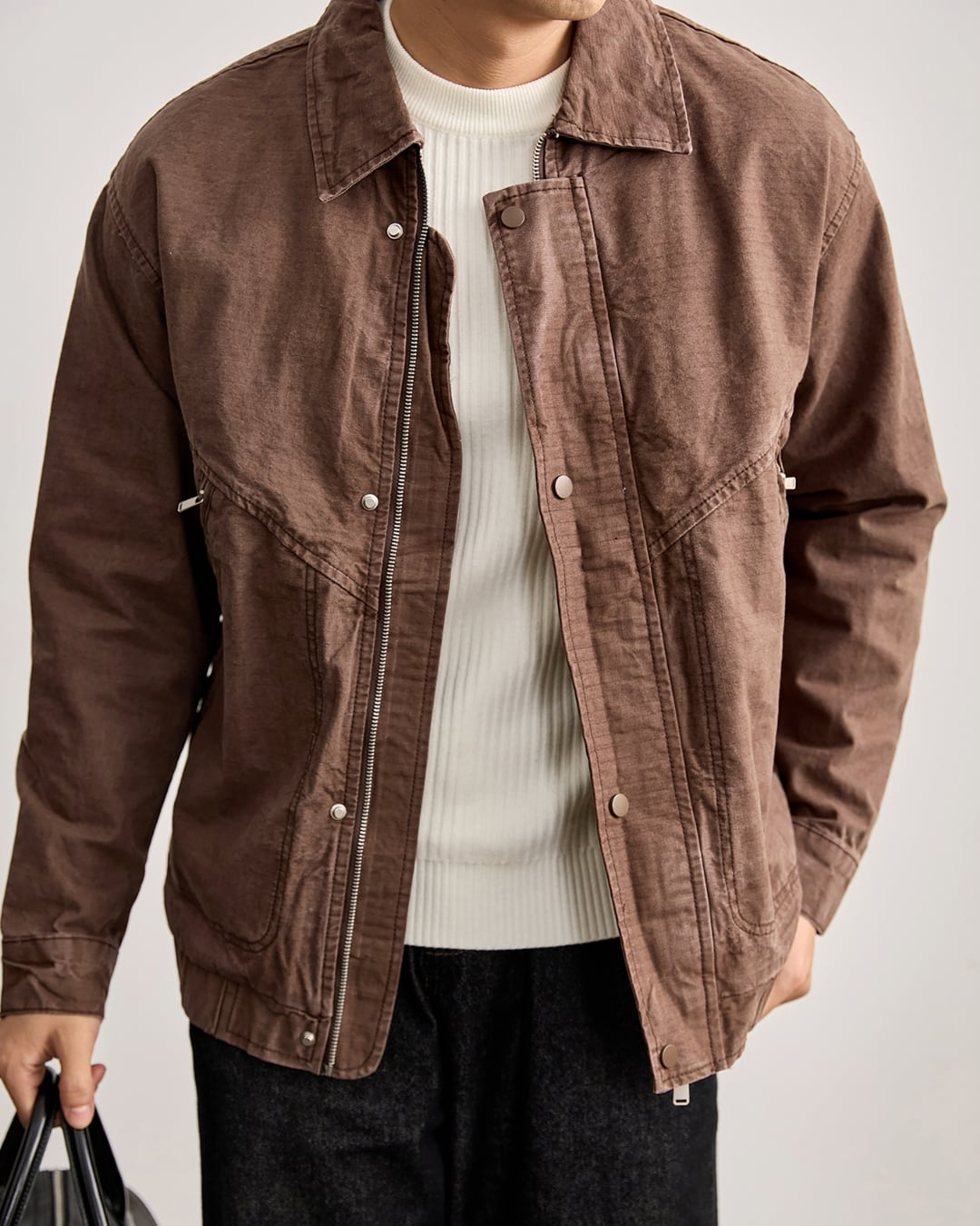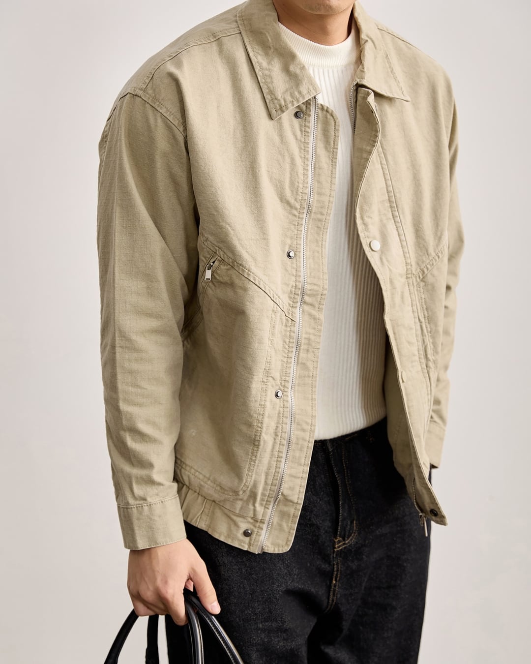 フロントはジップ+スナップ仕様で、開けても閉めてもサマになるデザイン。