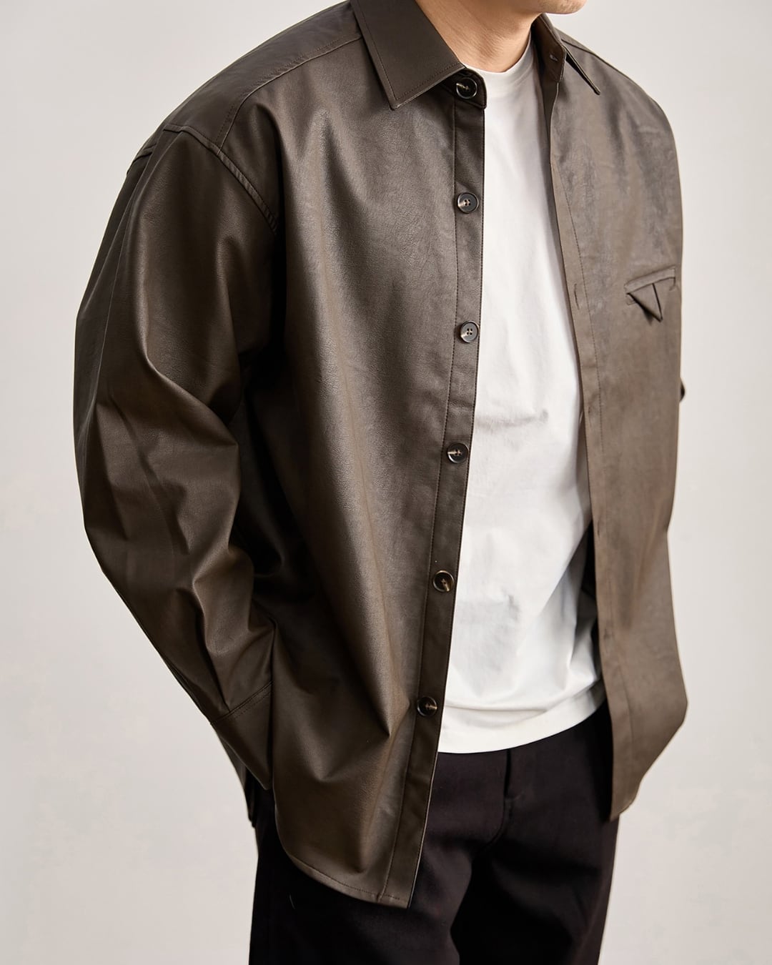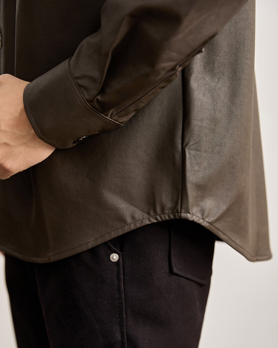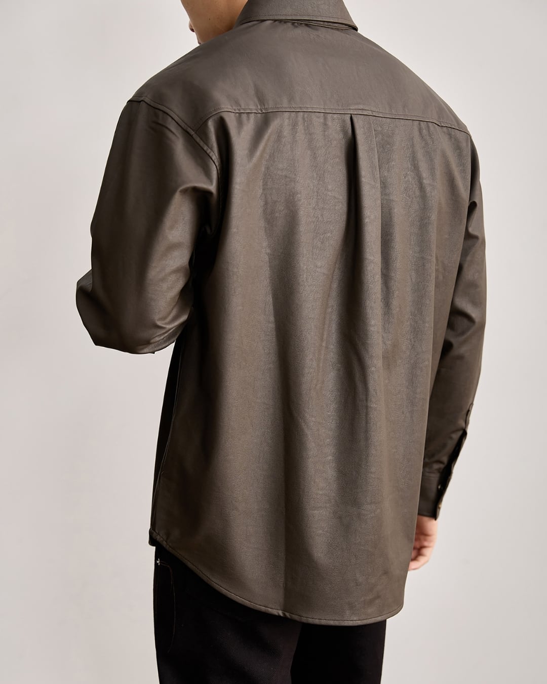 レザー調の表情がありながらも、硬さのない柔らかな着心地でデイリーに取り入れやすい仕上がりです。
