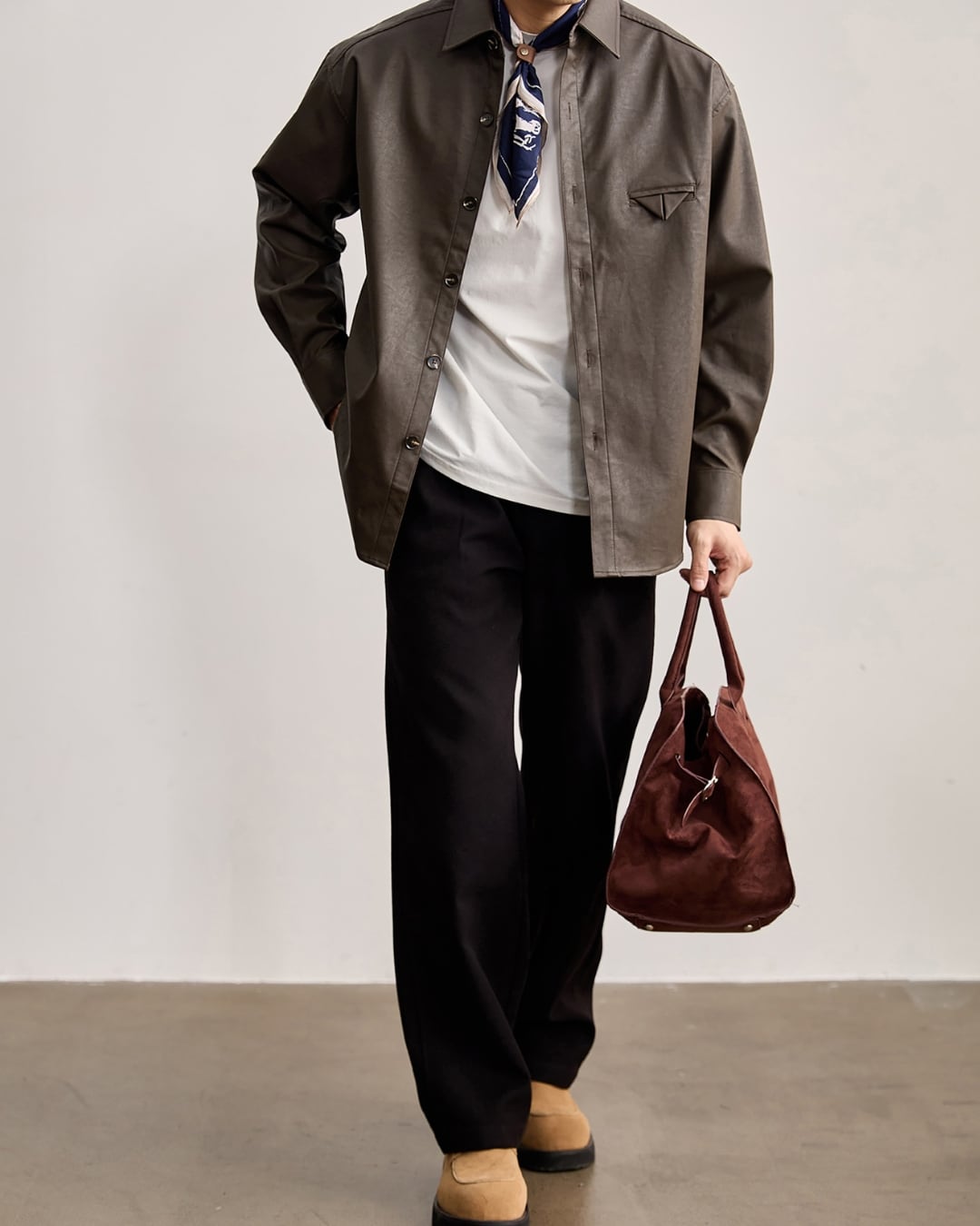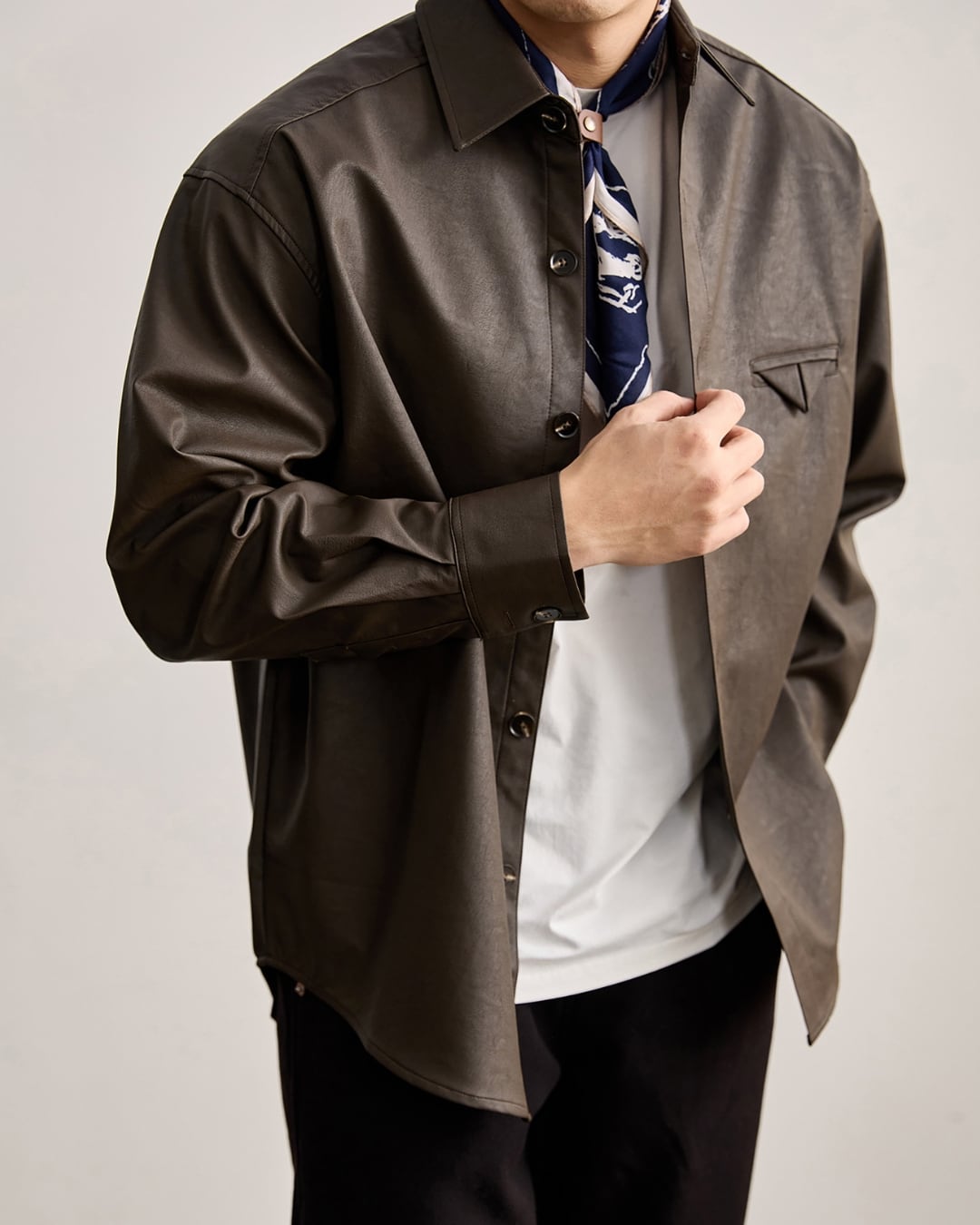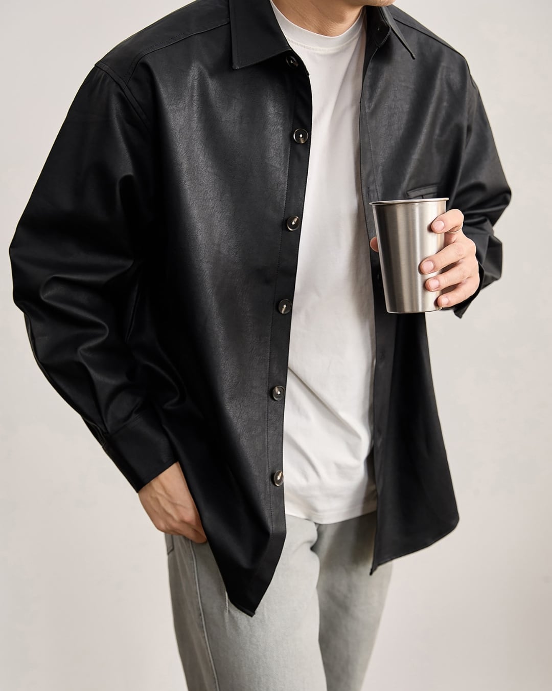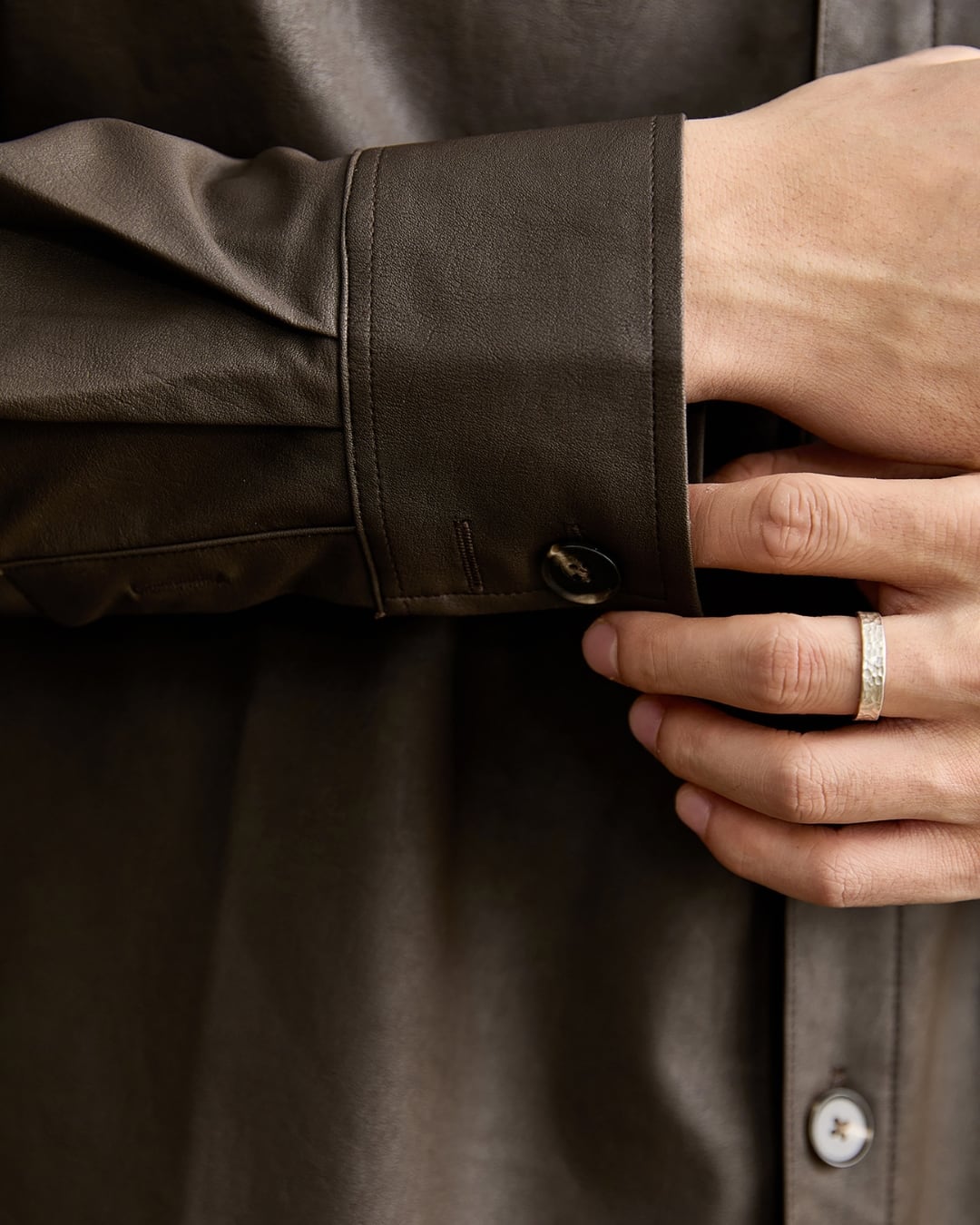 レザー調の表情がありながらも、硬さのない柔らかな着心地でデイリーに取り入れやすい仕上がりです。