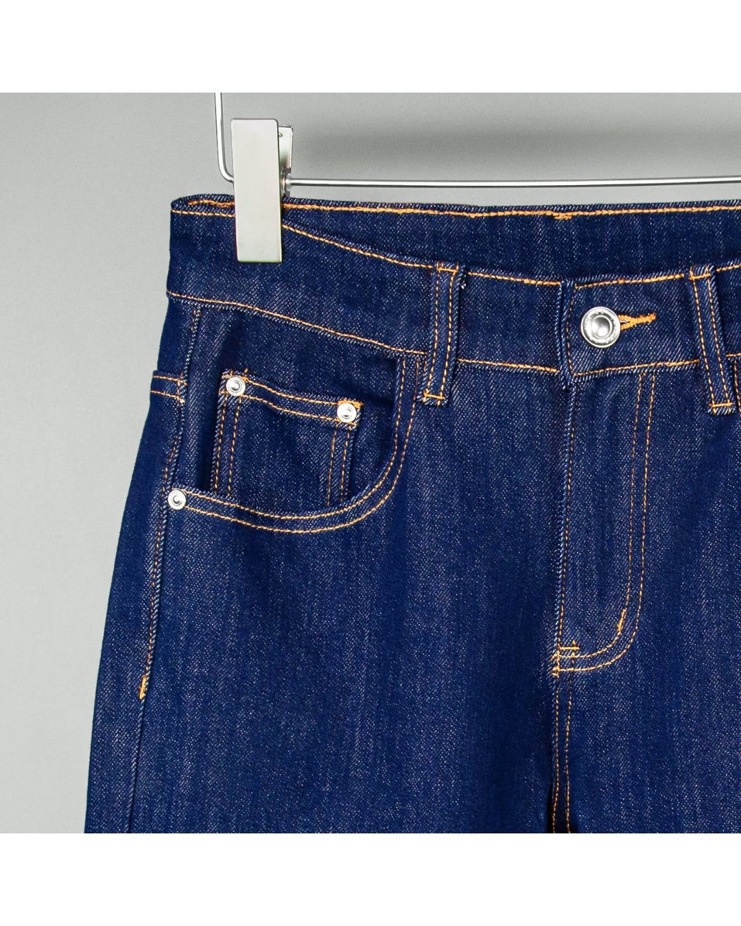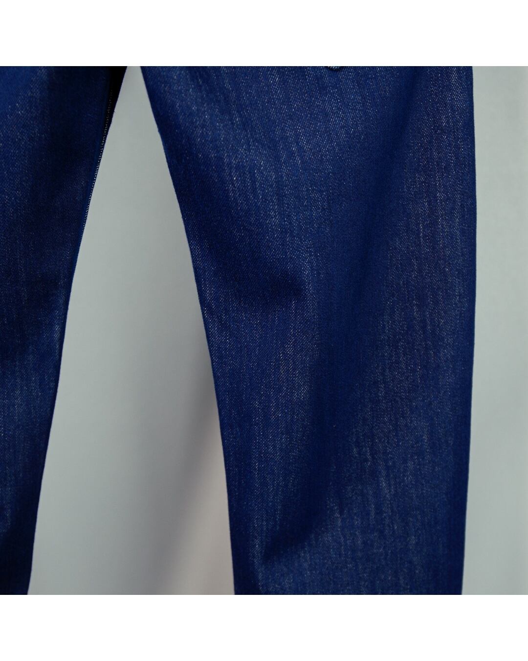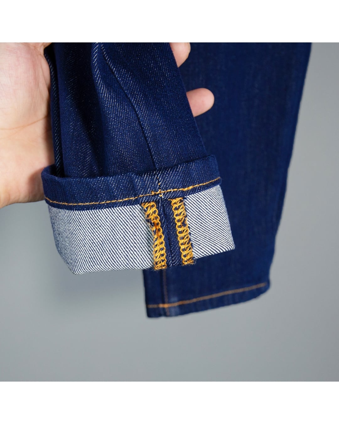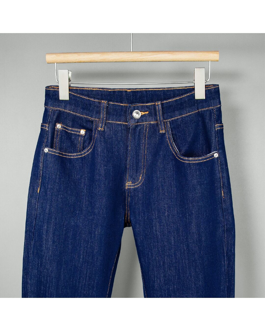実物撮影のデニム生地は、程よい厚みとハリ感を備え、シーズンを問わず着用可能。